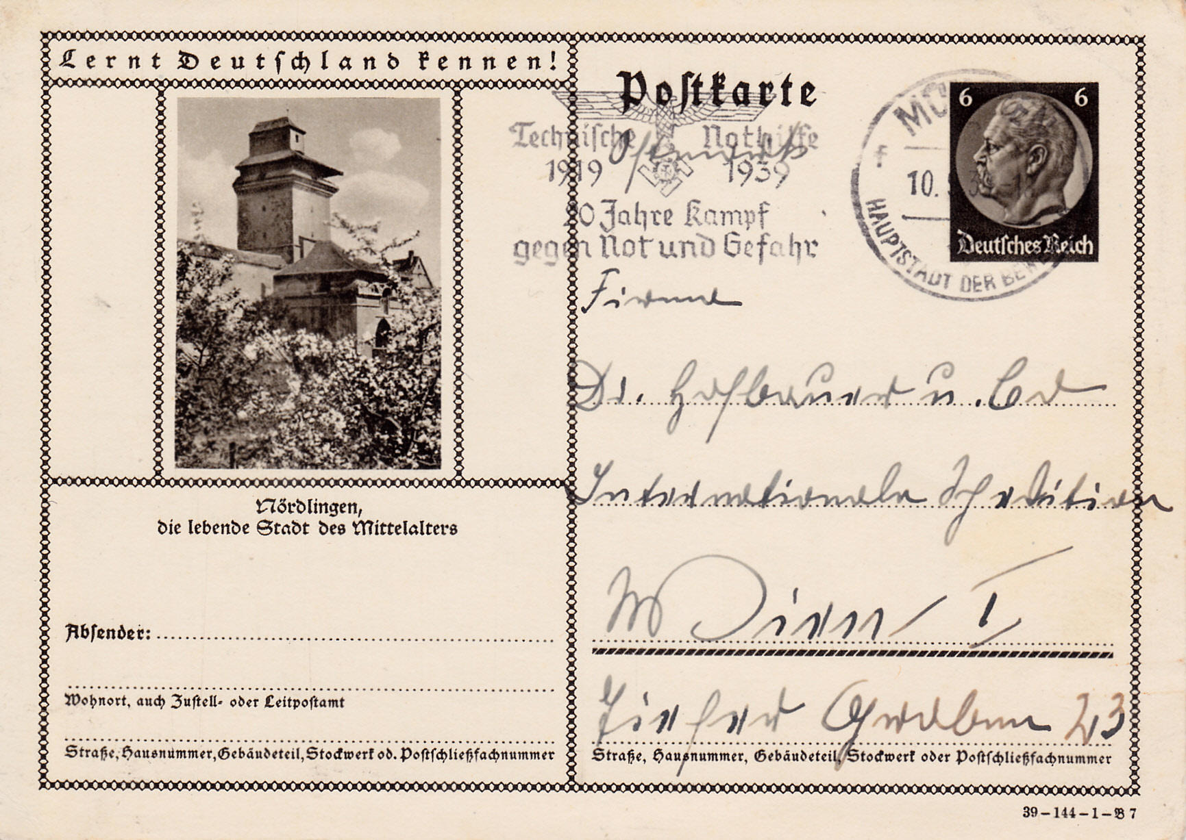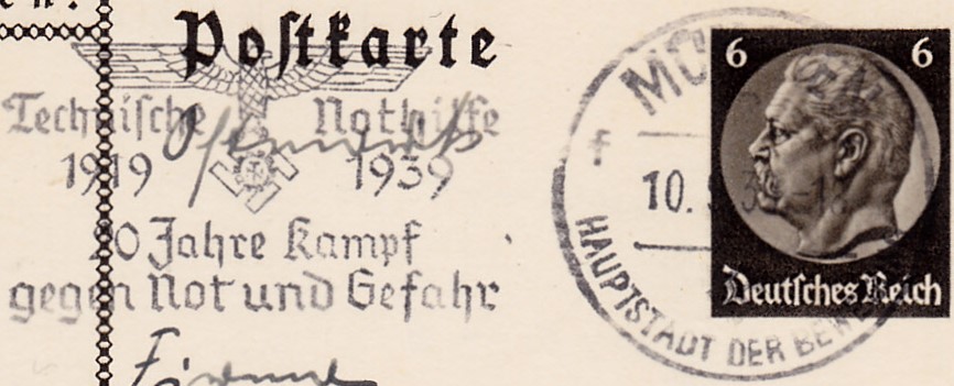 Maschinenwerbestempel München 8 Hauptstadt der Bewegung Kennbuchstabe "f" vom 10.9.1939 mit dem Werbeeinsatz "Technische Nothilfe 1919 1939 20 Kampf gegen Not und Gefahr" auf einer Bildpostkarte.