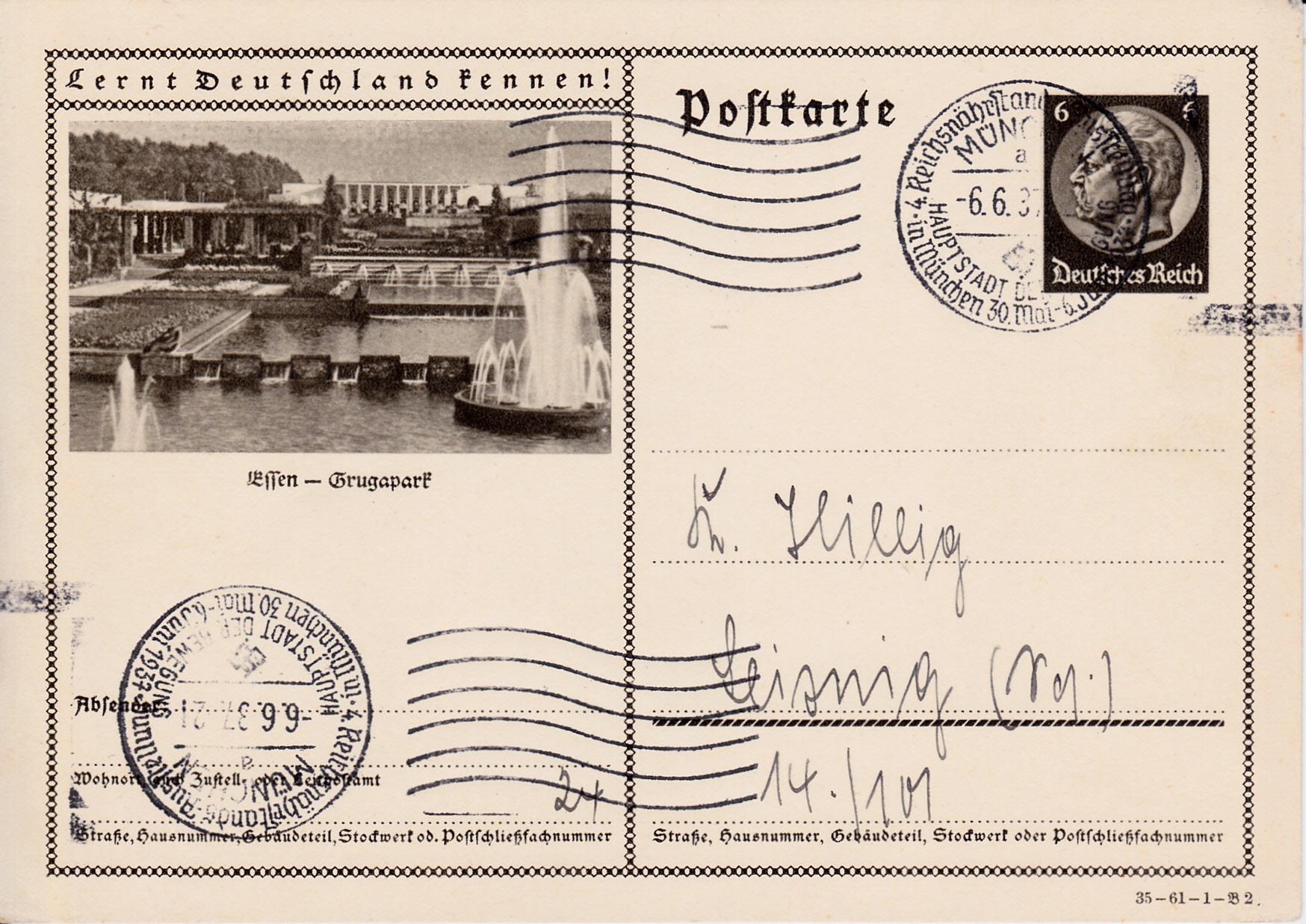 Stempel "München Hauptstadt der Bewegung" Kennbuchstabe "a" "4.Reichsnährstands-Ausstellung in München 30.Mai - 6.Juni" vom 6.6.1937 mit einem Welleneinsatz auf einer Bildpostkarte.