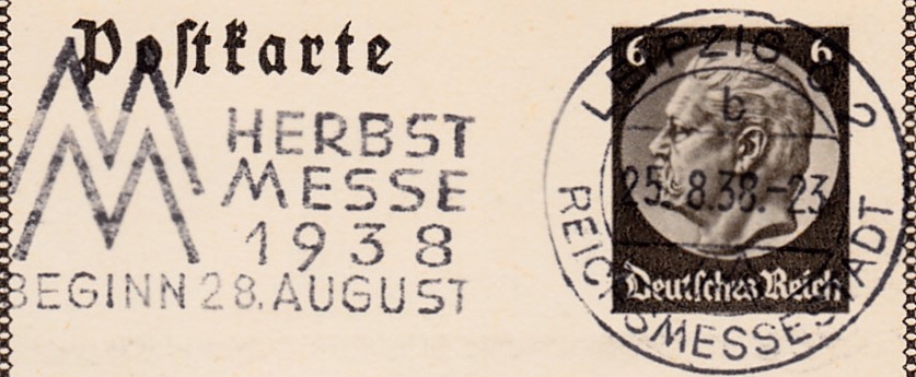 Maschinenwerbestempel Leipzig C 2 Reichsmessestadt Kennbuchstabe "b" vom 25.8.1938 mit dem Werbeeinsatz "Herbstmesse 1938 Beginn 28.August" auf einer Bildpostkarte.