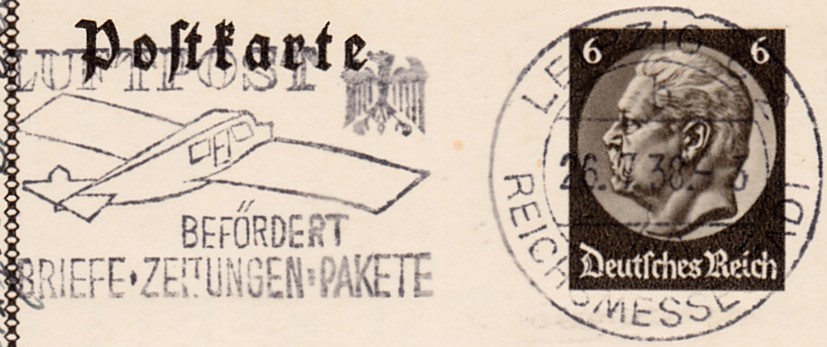 Maschinenwerbestempel Leipzig C 2 Reichsmessestadt Kennbuchstabe "b" vom 26.7.1938 mit dem Werbeeinsatz "Luftpost befördert Briefe Zeitungen Pakete" auf einer Bildpostkarte.