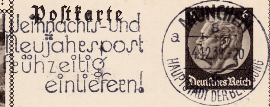 Maschinenwerbestempel "München 8 Hauptstadt der Bewegung" Kennbuchstabe "a" vom 14.12.1938 mit dem Werbeeinsatz "Weihnachts- und Neujahrspost frühzeitig einliefern" auf einer Bildpostkarte.