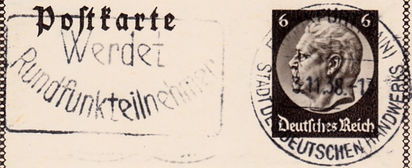 Maschinenwerbestempel "Frankfurt (Main) Stadt des deutschen Handwerks" vom 3.11.1938 mit dem Werbeeinsatz "Werdet Rundfunkteilnehmer" auf einer Bildpostkarte.
