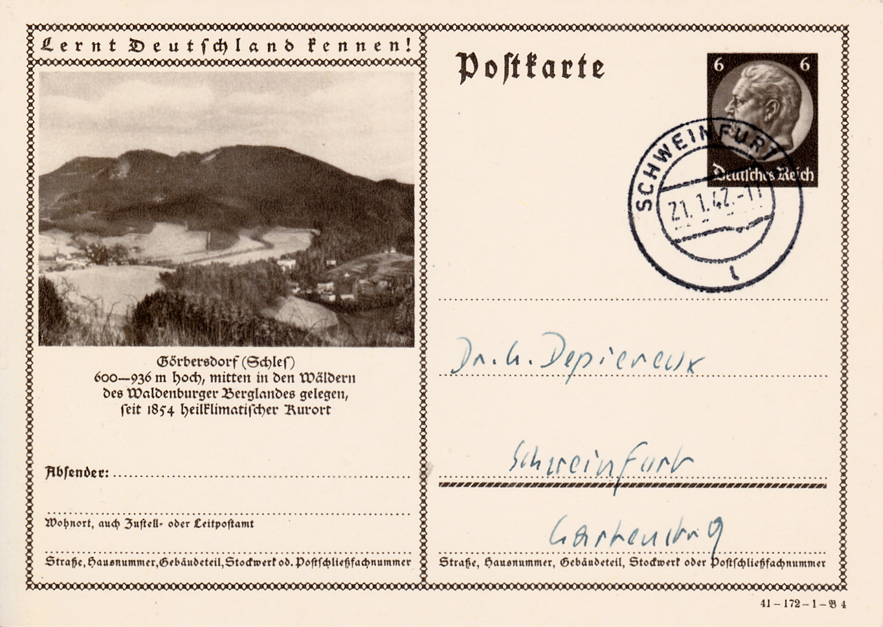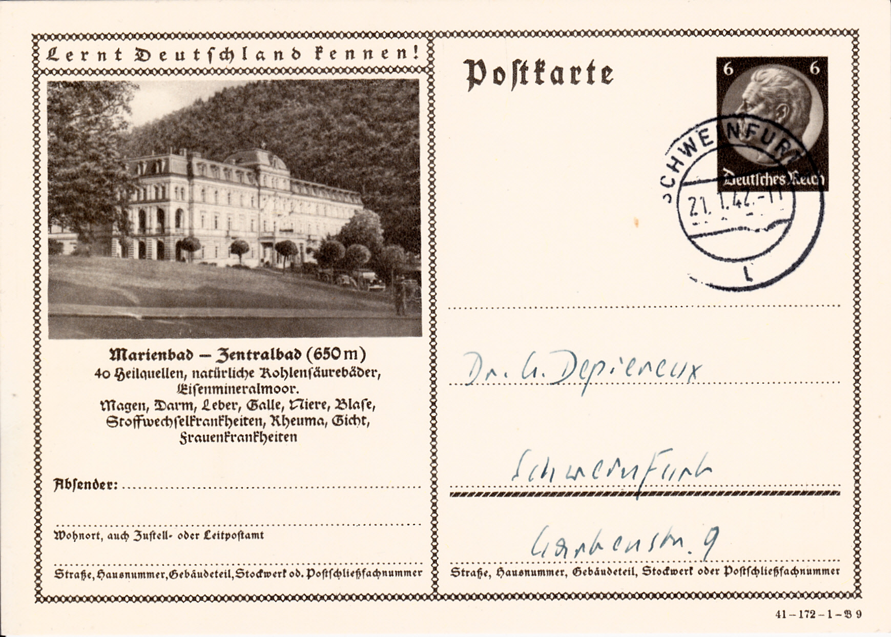 Freiwaldau wiederholt auf dieser Karte (Serie 172 Bild 2) die Werbung für seine Wasserheilanstalt und Kaltwasserkuren nach Vincenz Prießnitz in Gräfenberg. Freiwaldau heißt heute Jeseník (bis 1947 Frývaldov) und ist eine Stadt im tschechischen Olomoucký kraj (Olmützer Region), und Gräfenberg heißt Lázně Jeseník.