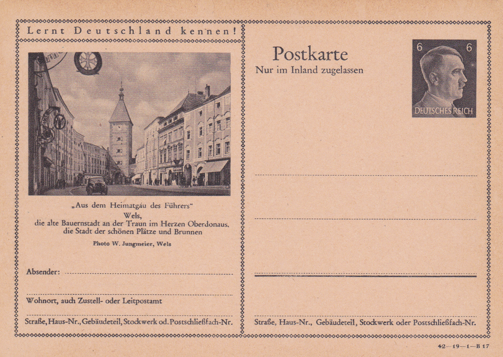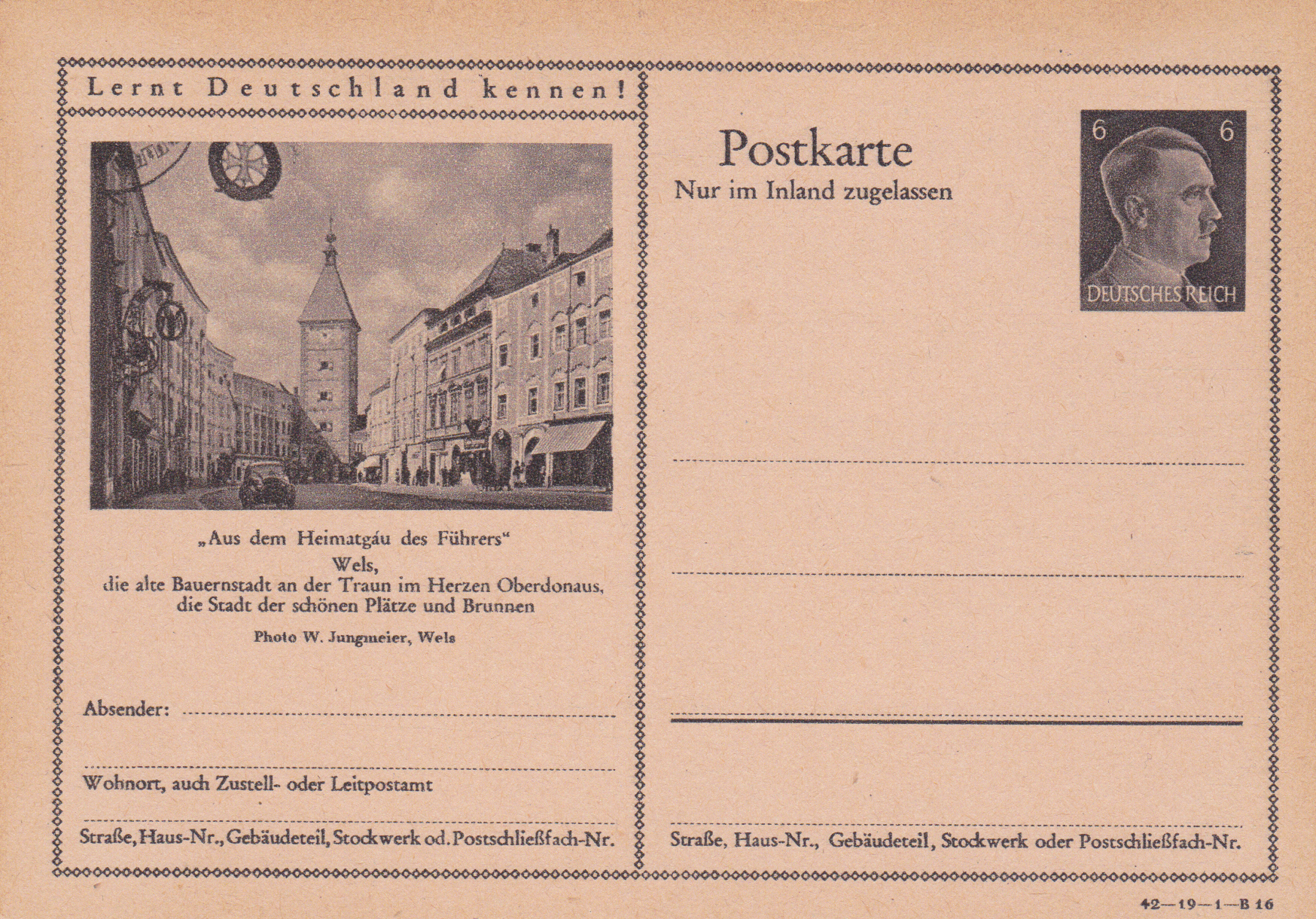 Wels, eine Stadt im oberösterreichischen Alpenvorland, zeigt auf einer Bildpostkarte 1942 (Serie 19 Bild 16) eine Ansicht mit dem Ledererturm, dem Wahrzeichen der Stadt.