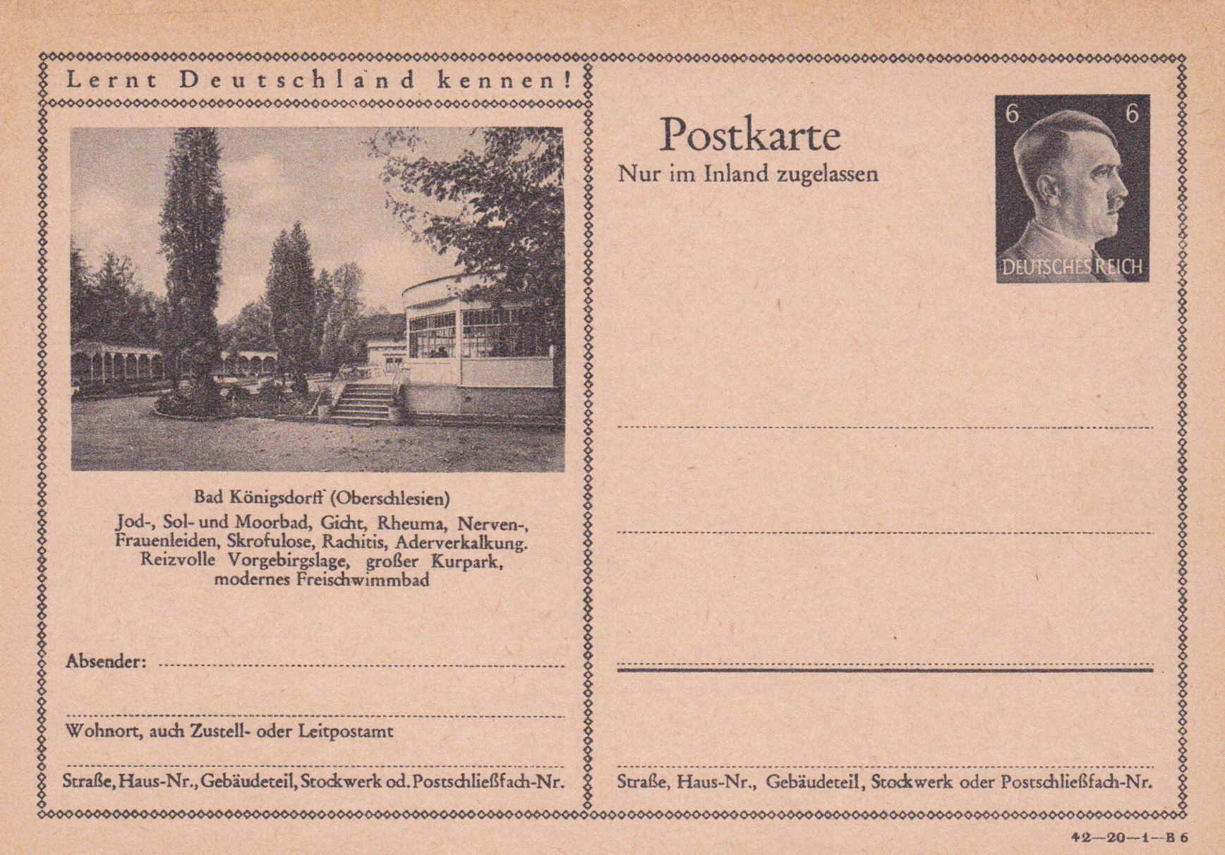 Bad Königsdorff (Oberschlesien) wirbt mit dieser Bildpostkarte (Serie 20 Bild 4) als Jod-, Sol- und Moorbad. Bad Königsdorff heißt heute Jastrzębie-Zdrój und ist eine oberschlesische Stadt im Süden Polens. Sie liegt rund 100 km westlich von Krakau sowie etwa 30 km nordöstlich von Ostrava in unmittelbarer Nähe der tschechischen Grenze.