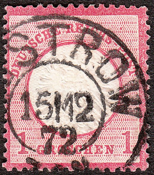 Hier eine nach oben dezentrierte MiNr. 19, entwertet am 04.10.1874 per nachverwendetem, schleswig-holsteinischem Zweikreisstempel GLÜCKSTADT, Feuser SH 054: