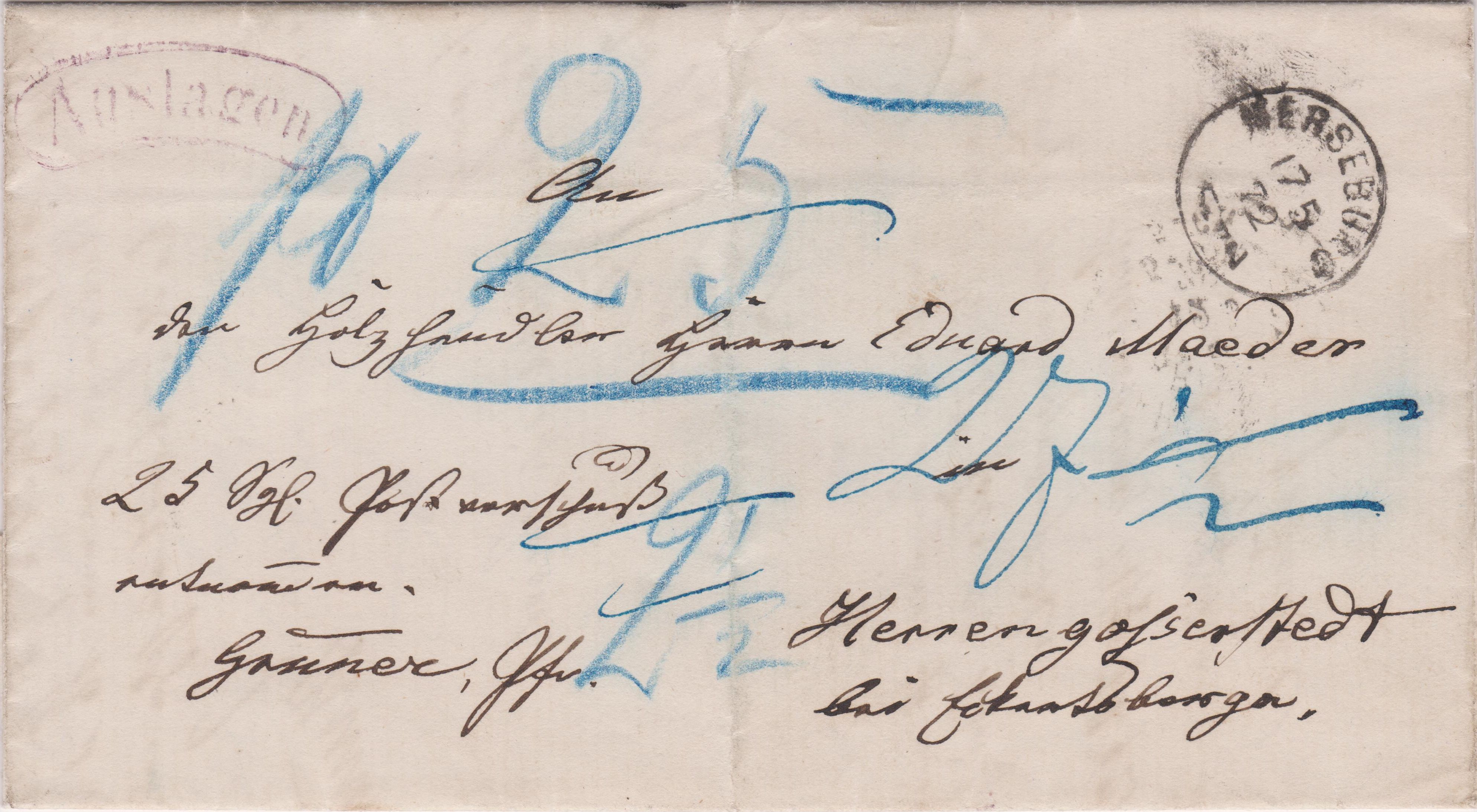 Bei der Einlieferung dieses Briefes erhielt der Absender 25 Silbergroschen als Postvorschuß, worauf ein violetter Stempel "Auslagen." hinweist. Als Porto für Postvorschußbriefe galt die Beförderungsgebühr wie für Wertbriefe, hier 1 1/2 Groschen für eine Entfernung von bis zu 5 Meilen, plus 1/2 Groschen je angefangenem Taler an Postvorschuß bei einer Mindestgebühr von 1 Groschen, die in diesem Falle erhoben wurde.