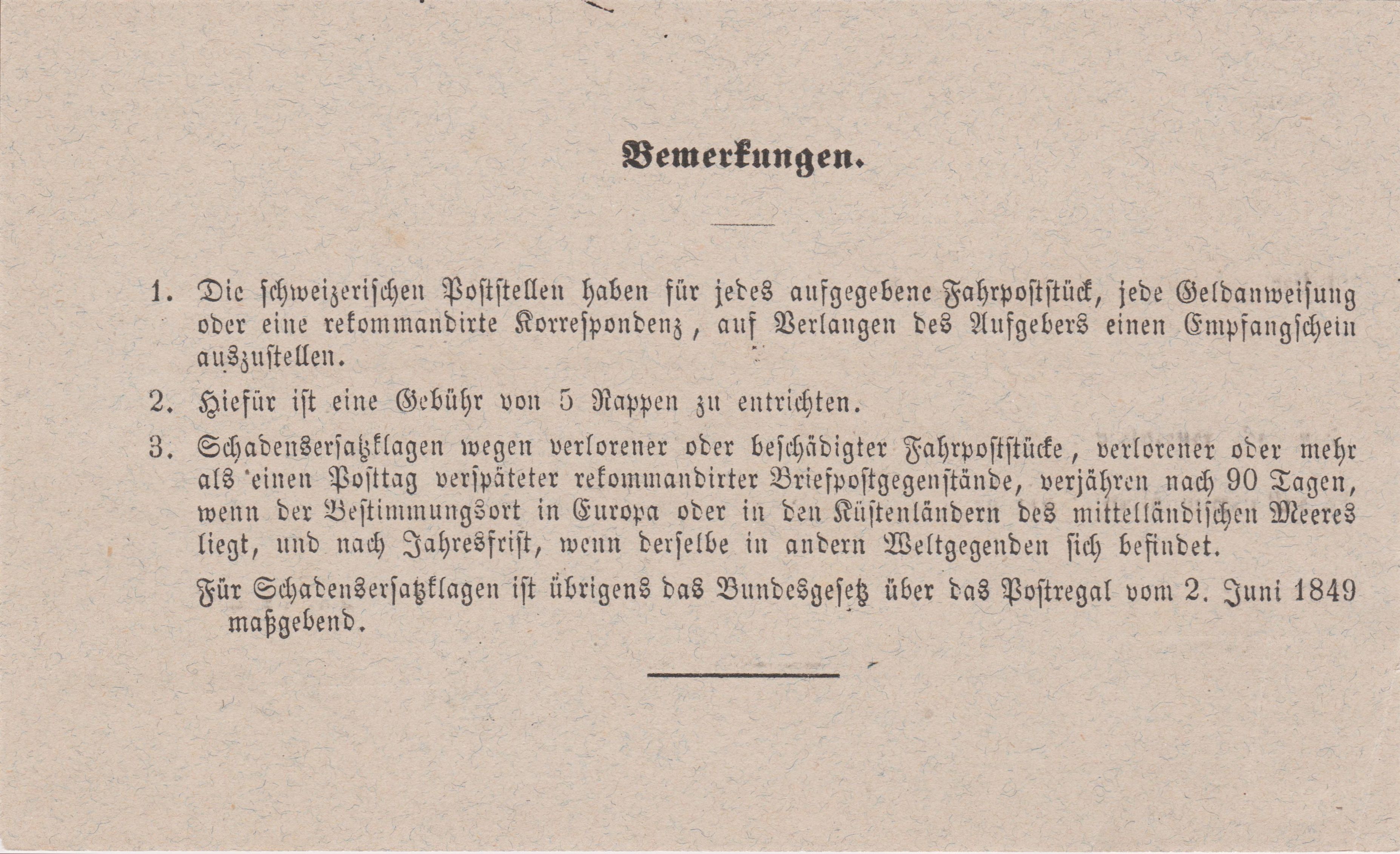 Hier ein Formular "Empfangschein" aus der Schweiz, am 03.10.1874 in "GRÜNINGEN" ausgestellt "für ein Mandat" = eine Postanweisung: