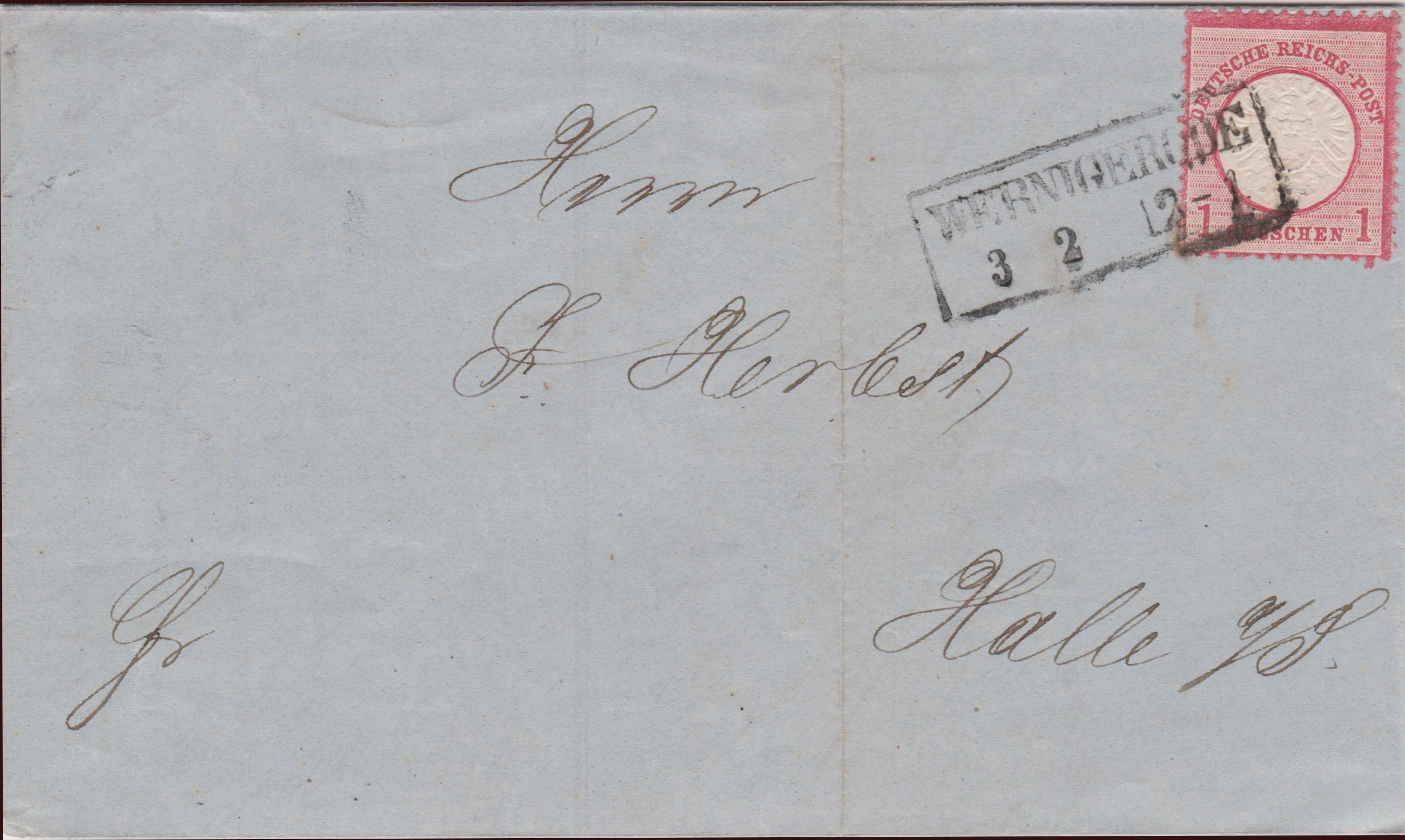 Hier eine Einzelfrankatur der MiNr. 19 auf Brief nach Halle an der Saale, aufgegeben am 03.02.1874 in Wernigerode: