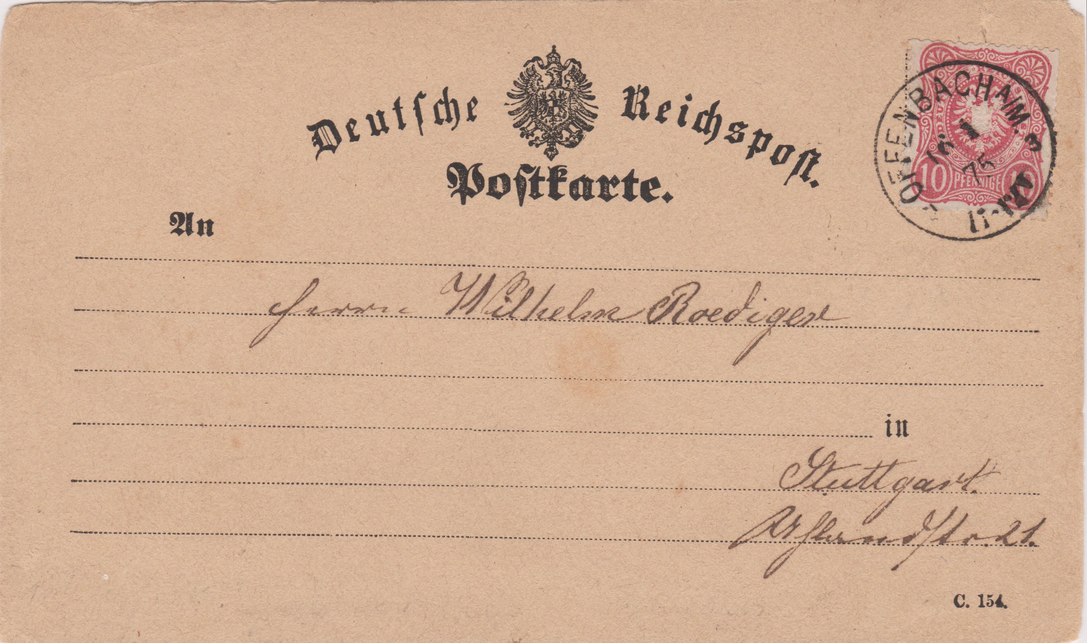 Diese Postkarte wurde adressiert nach Stuttgart = Württemberg, wofür die Inlandsgebühr von 5 Pfennigen galt. Der Absender frankierte diese Postkarte jedoch am 16.01.1875 in Offenbach am Main, einer Sendung ins Ausland entsprechend, mit 10 Pfennigen!!???