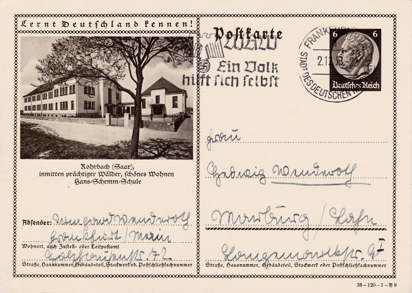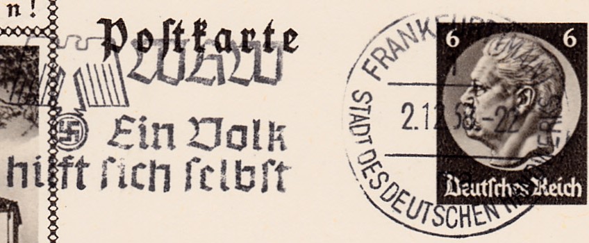 Maschinenwerbestempel "Frankfurt (Main) 1 Stadt des deutschen Handwerks" vom 2.12.1938 mit dem Werbeeinsatz "WHW Ein Volk hilft sich selbst" auf einer Bildpostkarte.