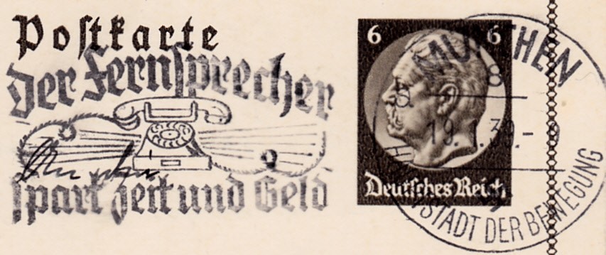 Maschinenwerbestempel "München 8 Hauptstadt der Bewegung" Kennbuchstabe "a" vom 19.1.1939 mit dem Werbeeinsatz "Der Fernsprecher spart Zeit und Geld" auf einer Bildpostkarte.
