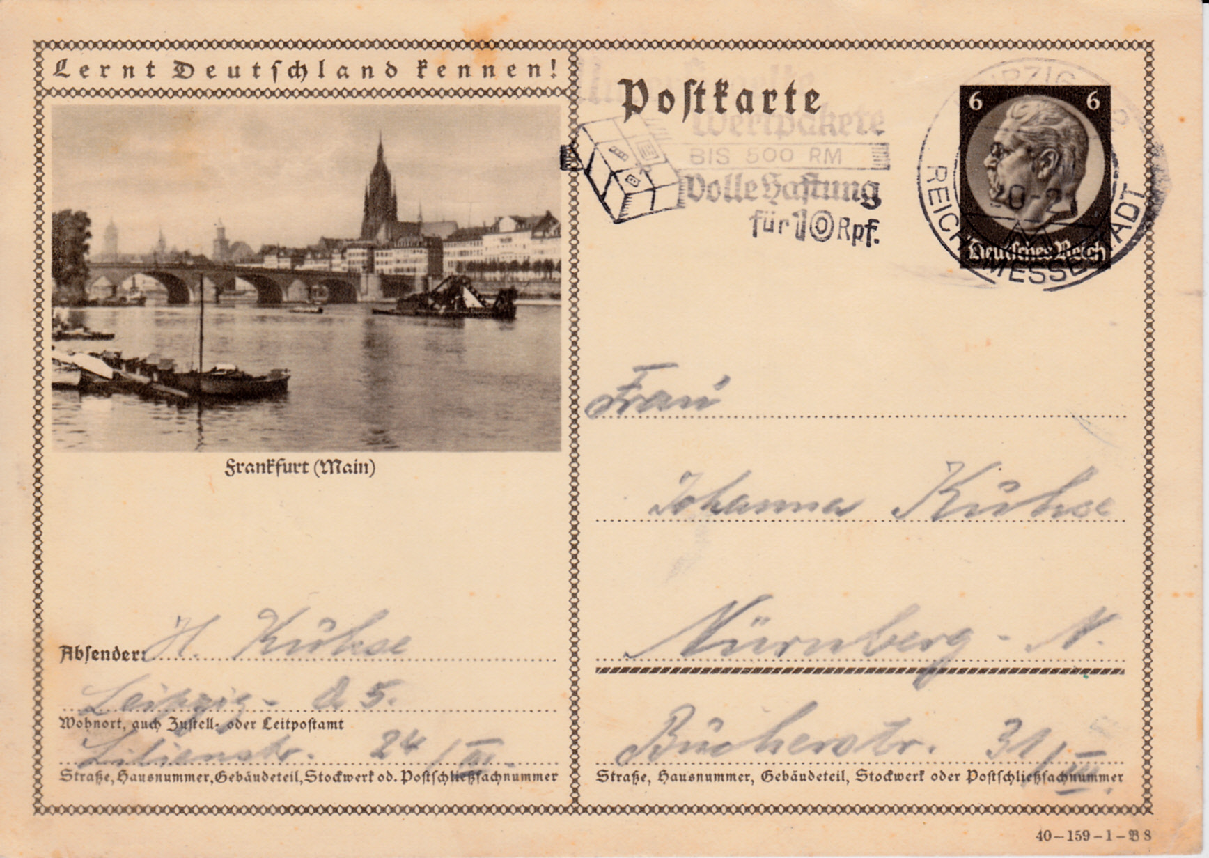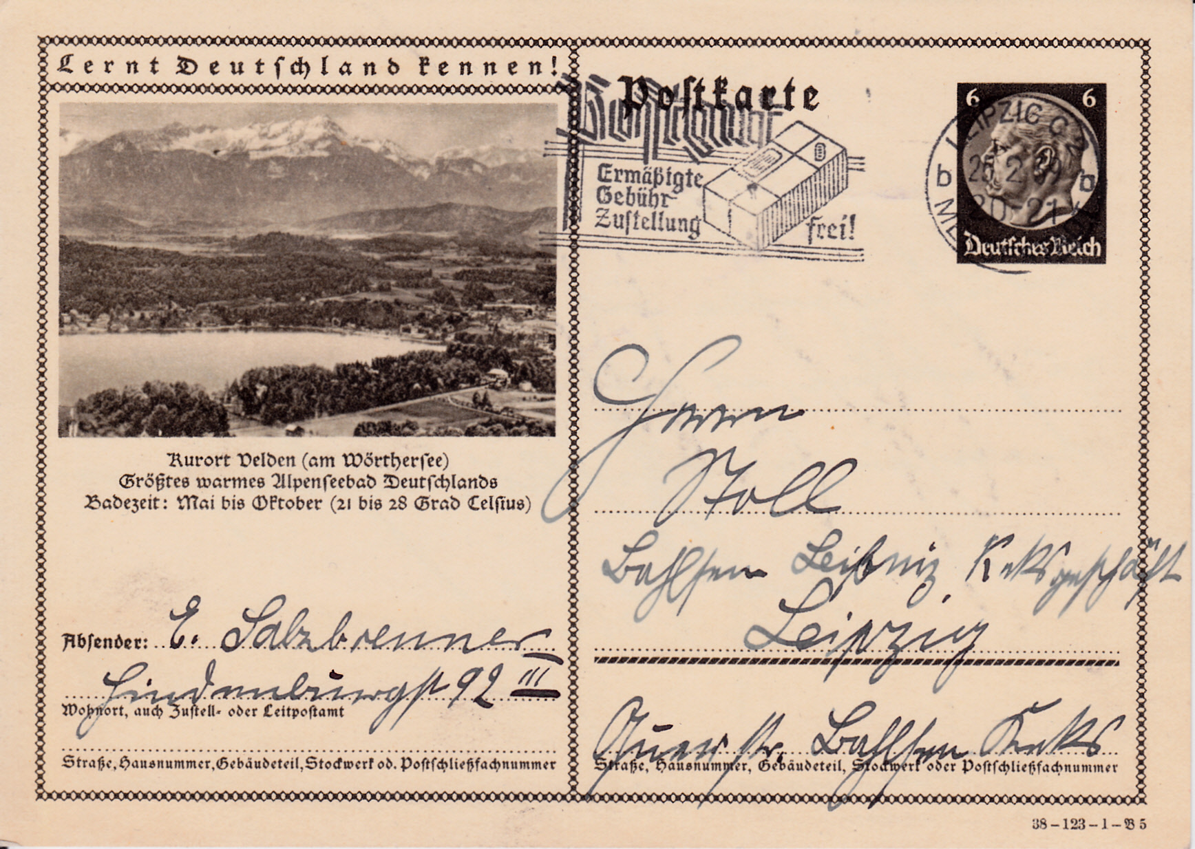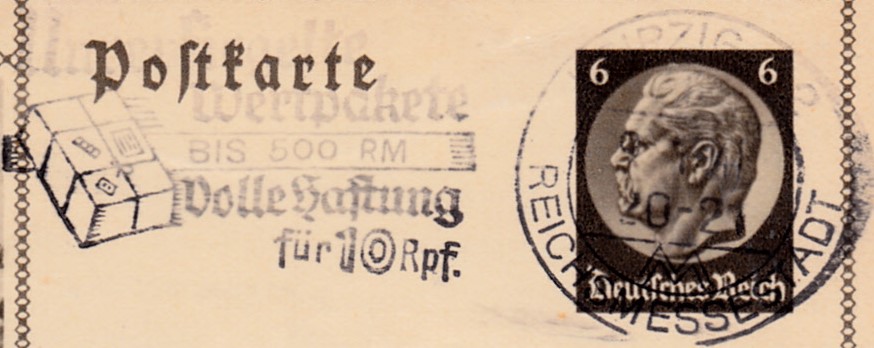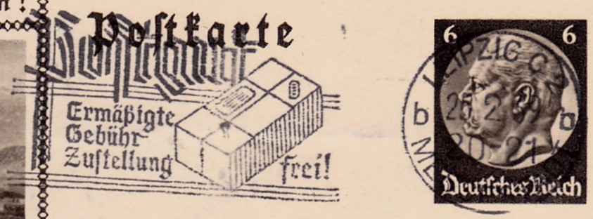 Maschinenwerbestempel Leipzig C 2 Messestadt Kennbuchstabe "b" vom 25.2.1939 mit dem Werbeeinsatz "Postgut Ermäßigte Gebühr Zustellung frei!" auf einer Bildpostkarte.