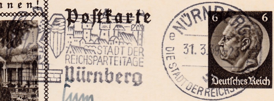 Maschinenwerbestempel Nürnberg Die Stadt der Reichsparteitage Kennbuchstabe "e" vom 31.3.1939 mit dem Propagandaeinsatz "Stadt der Reichsparteitage Nürnberg" auf einer Bildpostkarte.