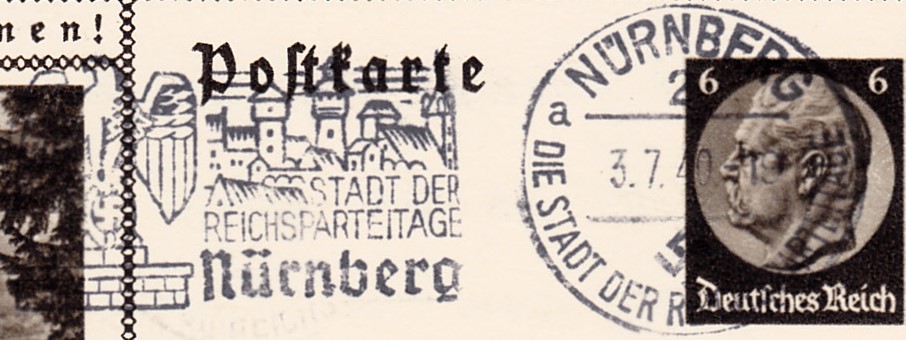 Maschinenwerbestempel "Nürnberg 2 Die Stadt der Reichsparteitage" mit dem Kennbuchstaben "a" vom 3.7.1940 mit dem Propagandaeinsatz "Stadt der Reichsparteitage Nürnberg" auf einer Bildpostkarte.