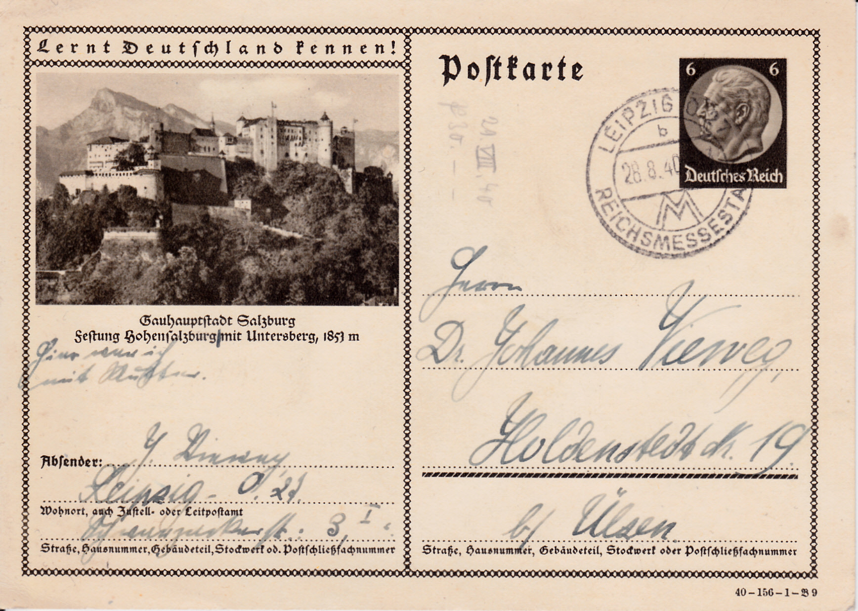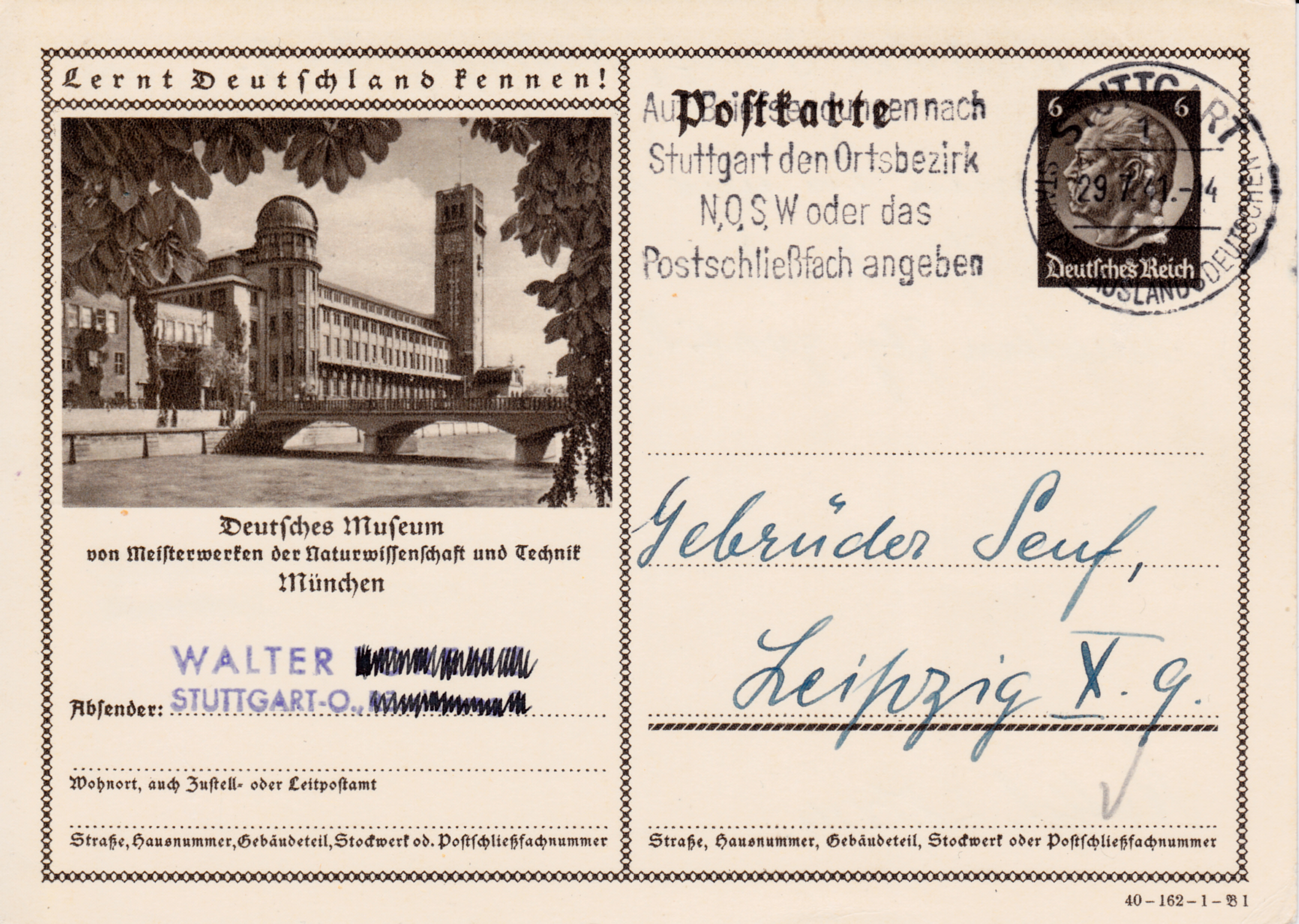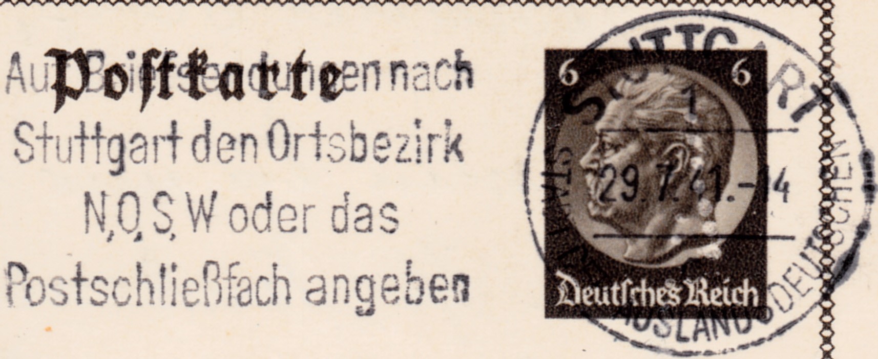 Diese Bildpostkarte wurde am 29.7.1941 mit dem Maschinenstempel "STUTTGART 1 Stadt der Auslandsdeutschen" mit dem Werbeeinsatz "Auf Briefsendungen nach Stuttgart den Ortsbezirk NB, O, S, W oder das Postschließfach angeben" gestempelt.