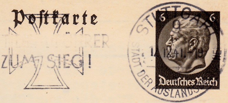 Diese Bildpostkarte wurde am 12.12.1941 mit dem Maschinenstempel "STUTTGART 9 Stadt der Auslandsdeutschen" mit dem Werbeeinsatz "Mit dem Führer zum Sieg" gestempelt.