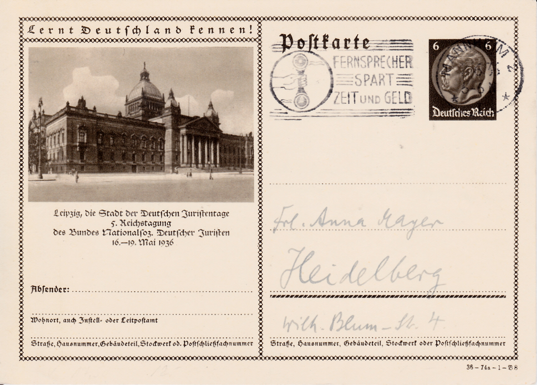 Mit Bildpostkarten machte Leipzig auf die 5. Reichstagung des Bundes Nationalsoz. Deutscher Juristen vom 16.-19. Mai 21936 aufmerksam. Die Abbildung zeigt das Gebäude des ehemaligen Reichsgerichts (Heute Sitz des Bundesverwaltungsgerichts) in Leipzig. Die Karteb gibt es mit mehreren Druckvermerken. Hier zeige ich die Karte mit dem Druckvermerk "36-74a-1-B 4" (Serie 74a Bild 4).