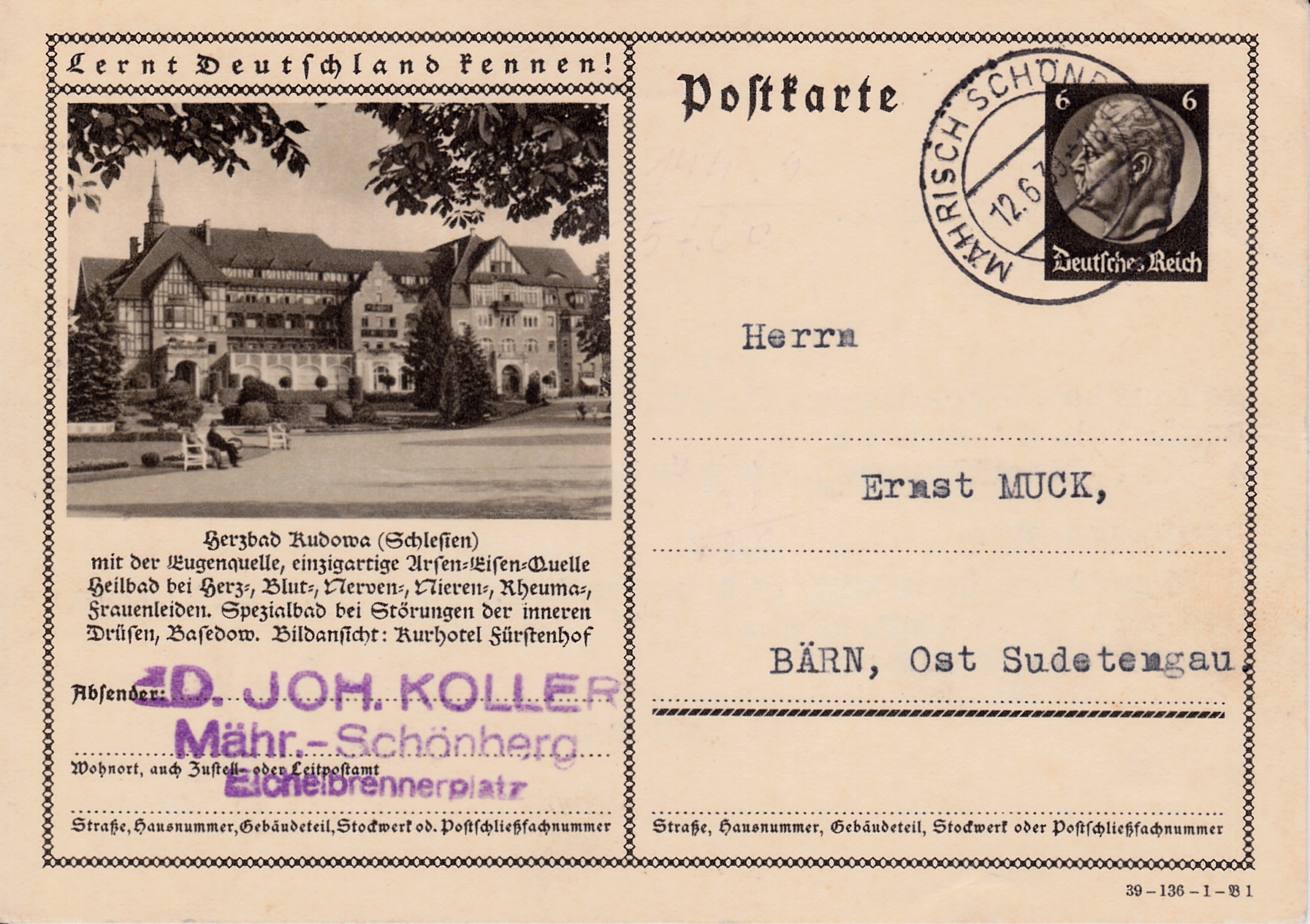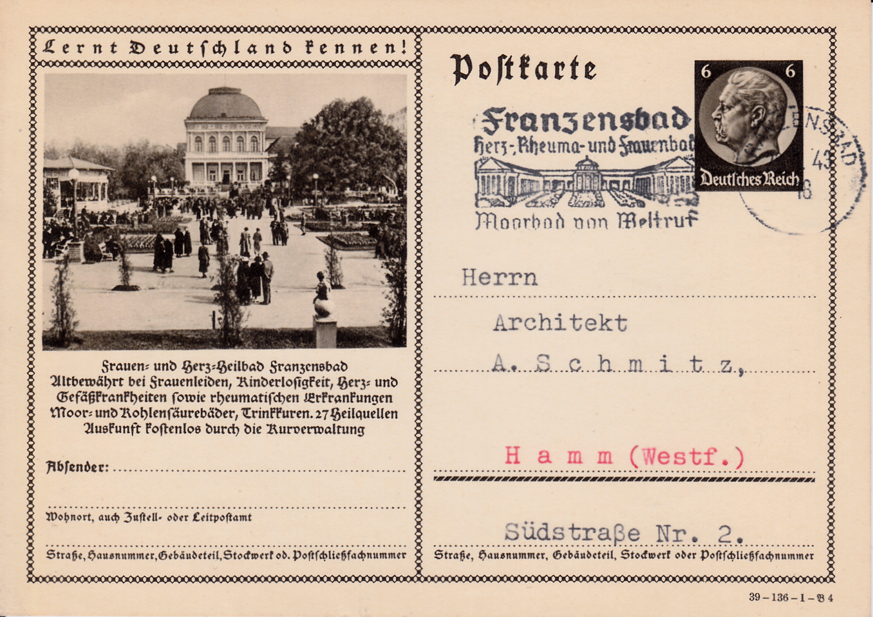 Franzensbad wirbt mit dieser Karte (Serie 136 Bild 4) für sein Kurangebot. Franzensbad heißt heute Františkovy Lázně und ist eine Stadt im Westböhmischen Bäderdreieck in Tschechien. Die Karte wurde auch in Franzensbad mit einem Maschinenwerbestempel gestempelt.