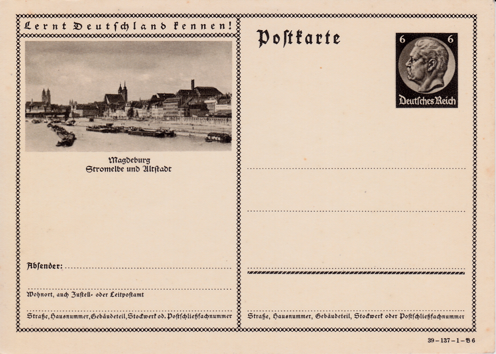 Das Foto aus dem Jahre 1938 mit der Elbe und der Altstadt Magdeburg wird auf dieser Bildpostkarte (Serie 137 Bild 6) wiederholt.
