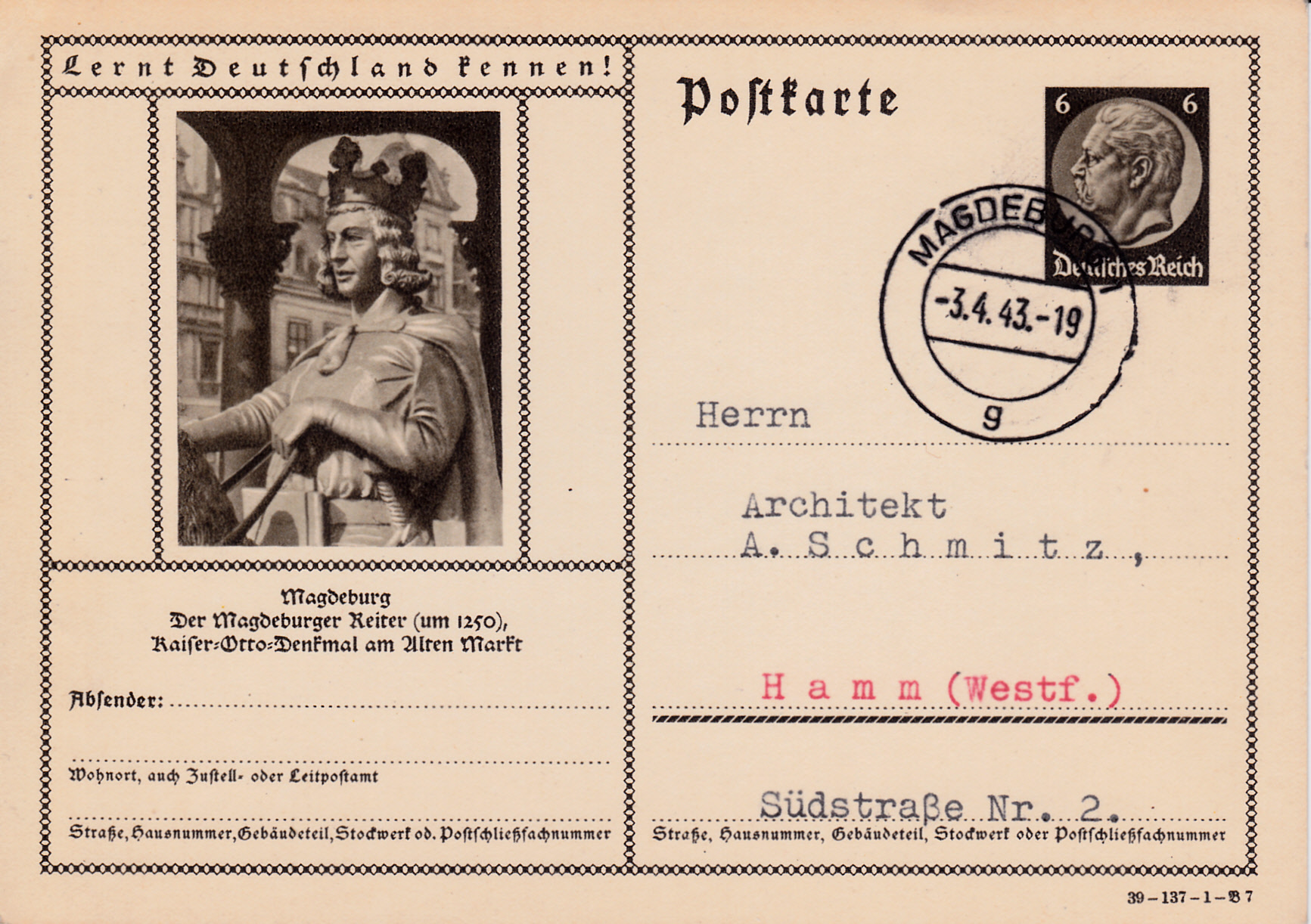 Das Foto auf dieser Karte (Serie 137 Bild 6) mit einem Detail des "Kaiser-Otto-Denkmals" (Magdeburger Reiter) wurde in den Vorjahren auch schon mehrfach gezeigt. Diese Kare wurde in Magdeburg gestempelt.