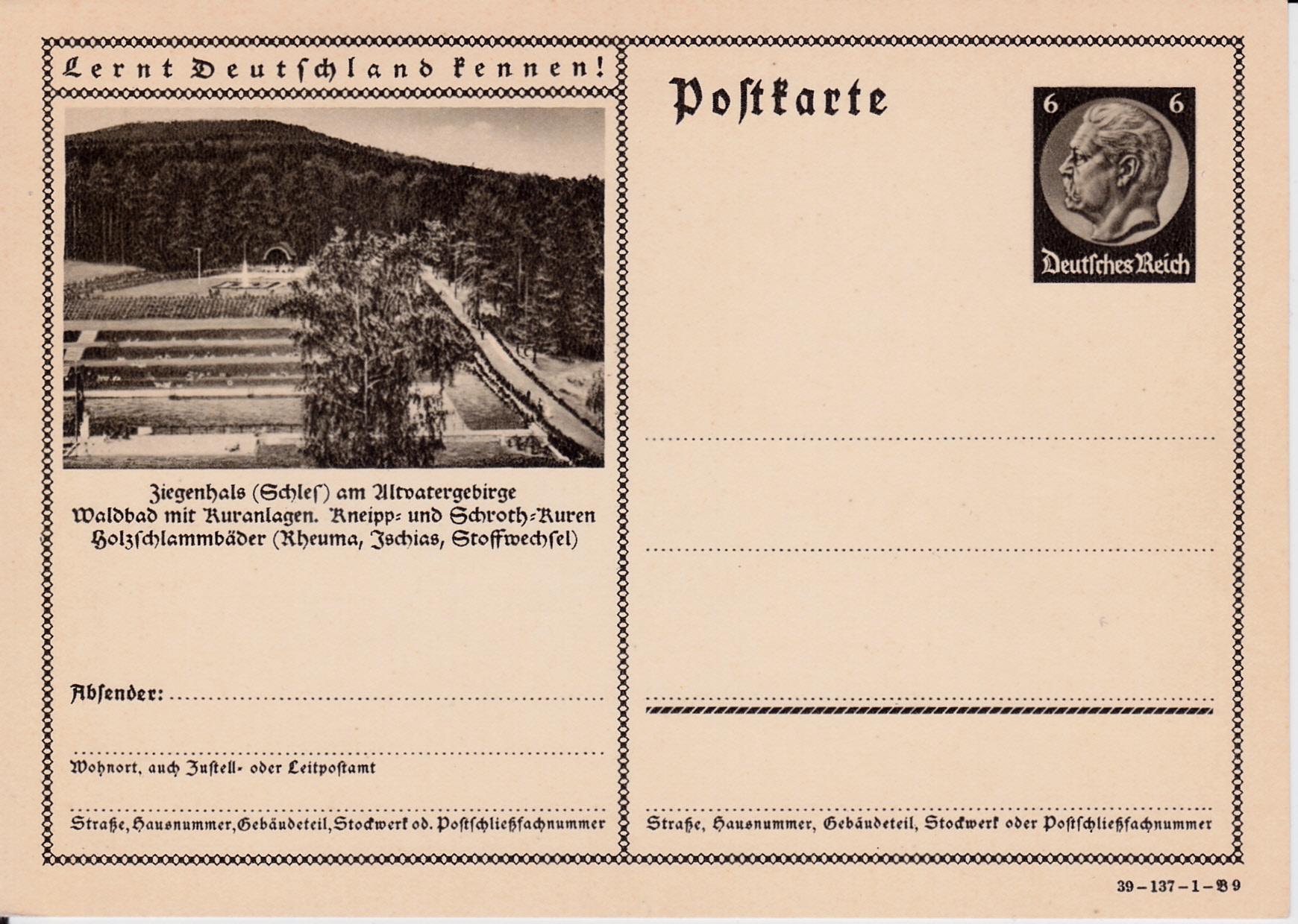Ziegenhals (Schlesien) zeigt auf dieser Karte (Serie 137 Bild 9) sein Waldbad und wirbt für seinen Kurbetrieb.