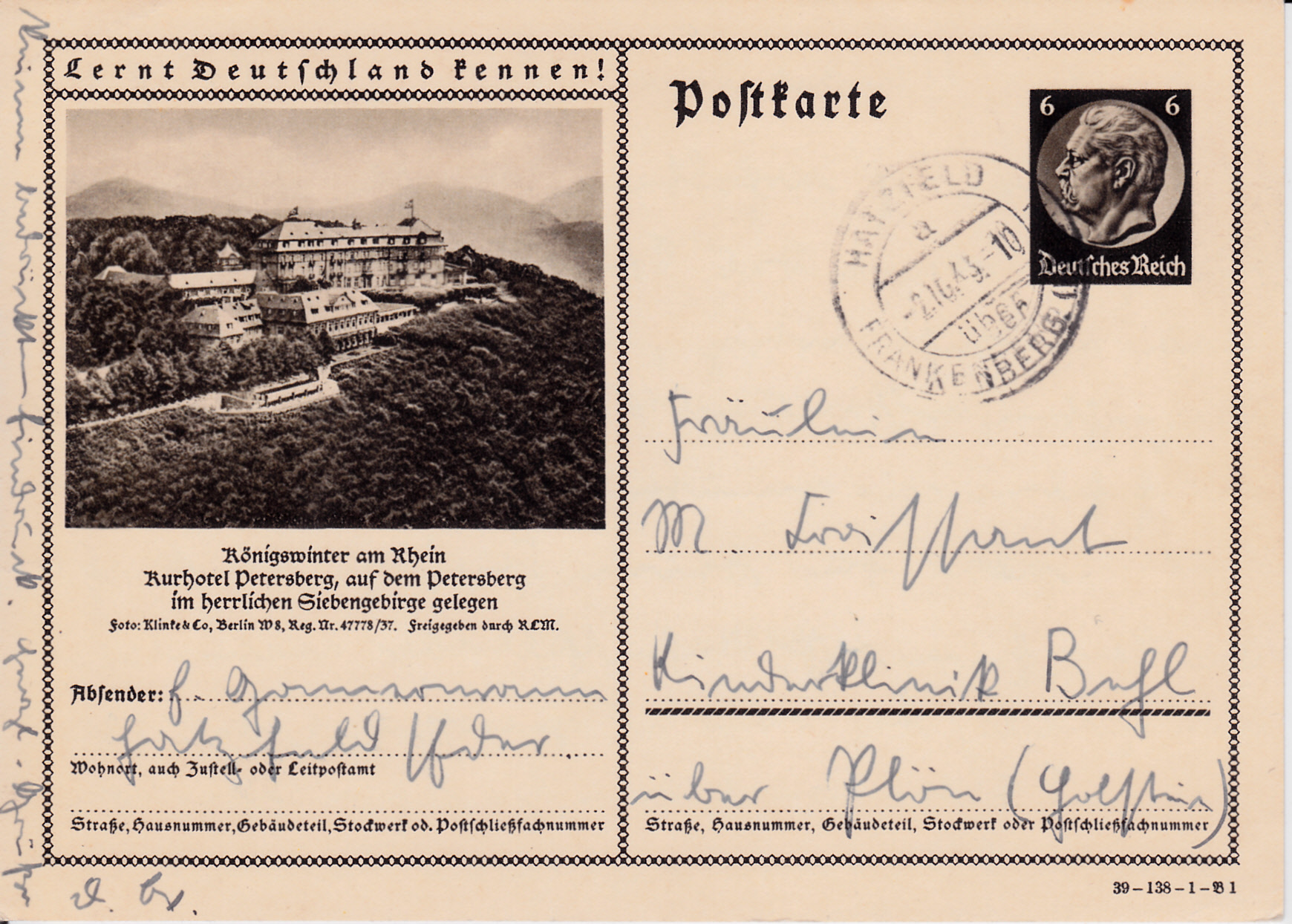 Ein etwas anderes anderes Foto mit dem Kurhotel Petersberg in Königswinter als in den vorangegangenen Jahren wird auf dieser Bildpostkarte 1939 (Serie 138 Bild 1) gezeigt.