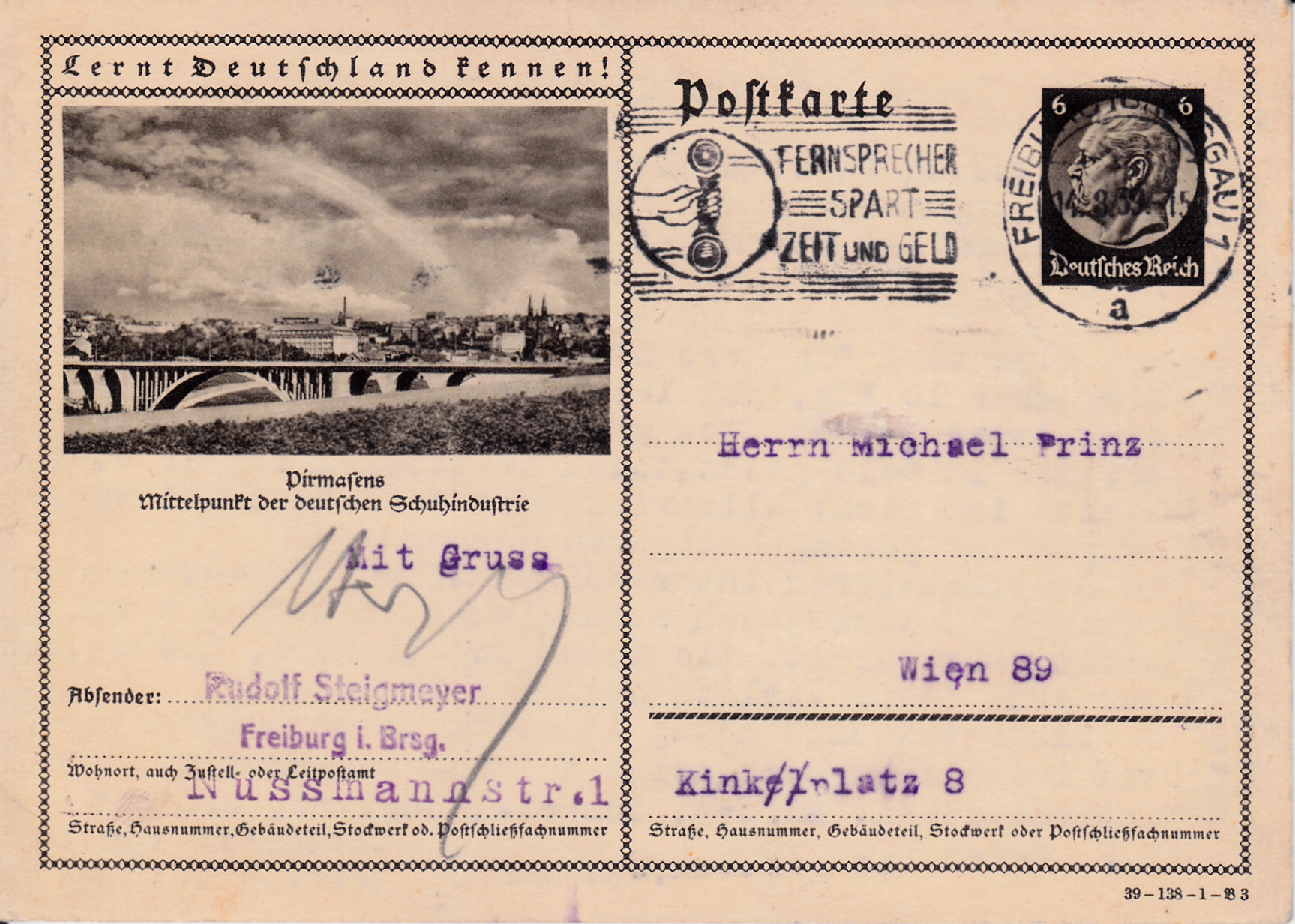 Pirmasens zeigt auf dieser Karte (Serie 138 Bild 3) eine Ansicht des Ortes und stellt sich als Zentrum der deutschen Schuhindustrie vor.