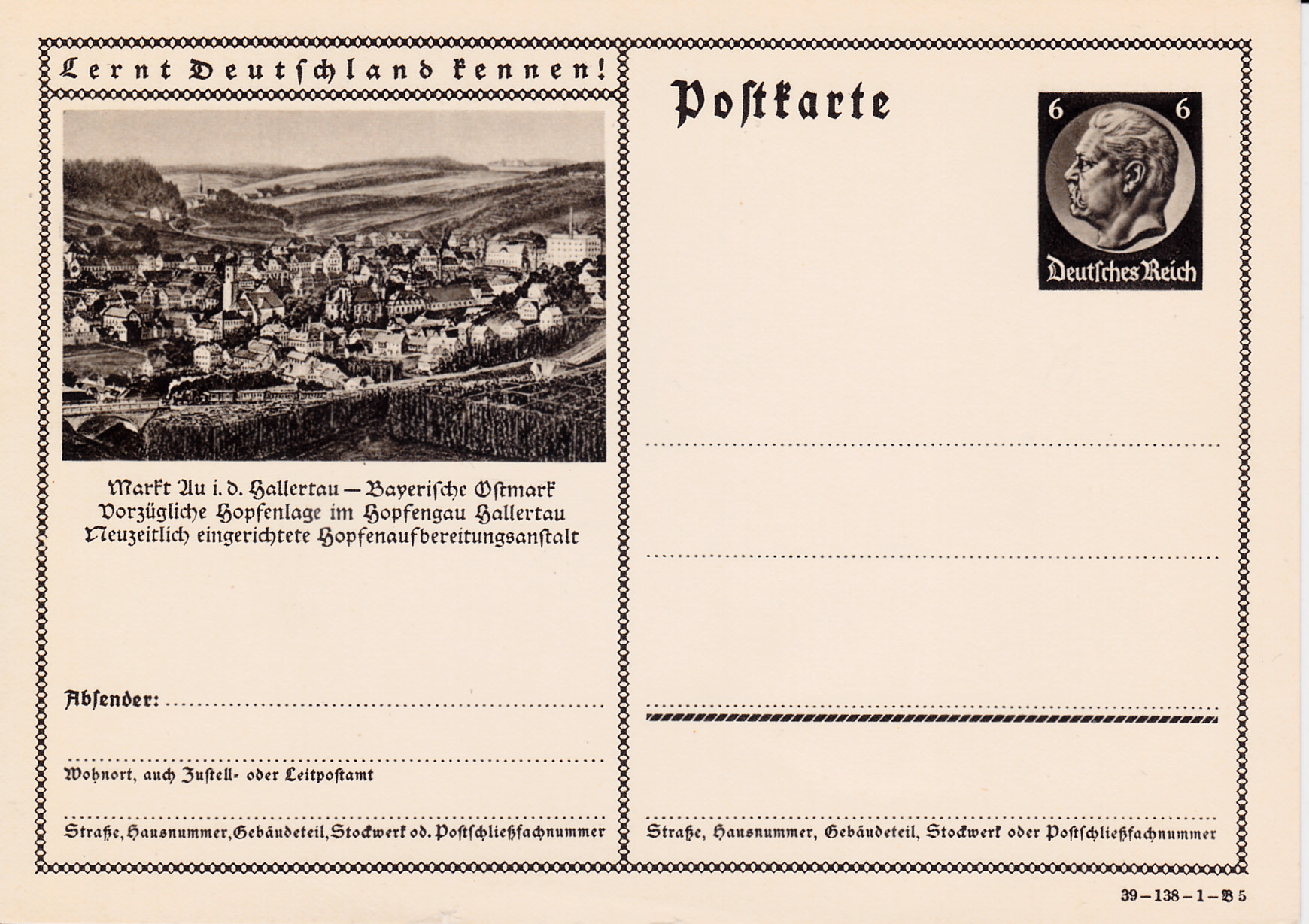 Au in der Hallertau ist auf dieser Karte (Serie 138 Bild 5) zu sehen. Im Vordergrund erkennt man Hopfenfelder.