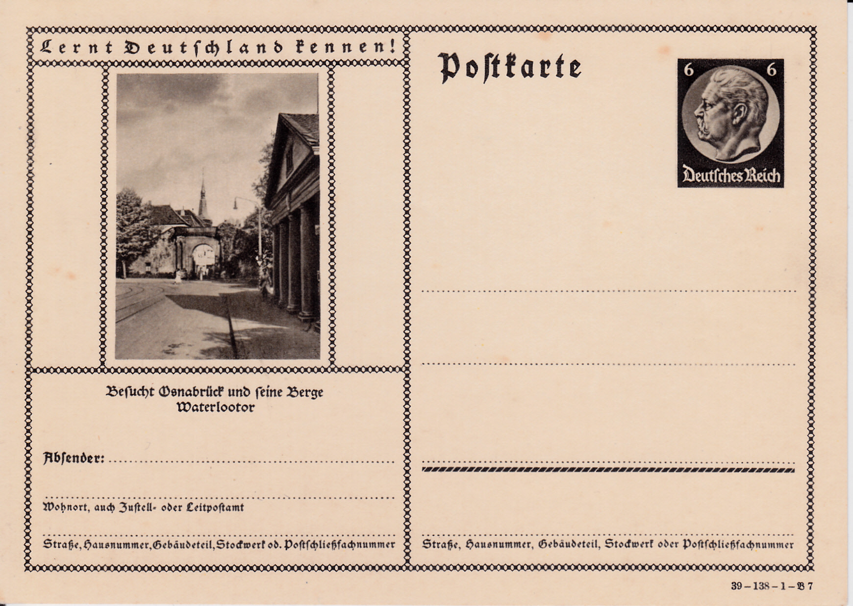 Osnabrück zeigt auf dieser Karte (Serie 138 Bild 7) das "Waterloo-Tor", ein Kriegerdenkmal in Osnabrück, das an die Schlacht bei Waterloo erinnert. Das Waterloo-Tor mit seinem umgebenden Bereich ist in Osnabrück als das "Heger Tor" bekannt, der Name "Waterloo-Tor" wird lokal kaum benutzt.