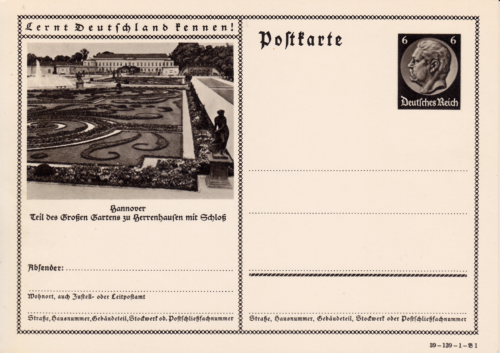 Hannover wiederholt auf dieser Karte (Serie 139 Bild 1) das Foto der Herrenhäuser Gärten mit Schloss der Karte aus dem Jahre 1937.