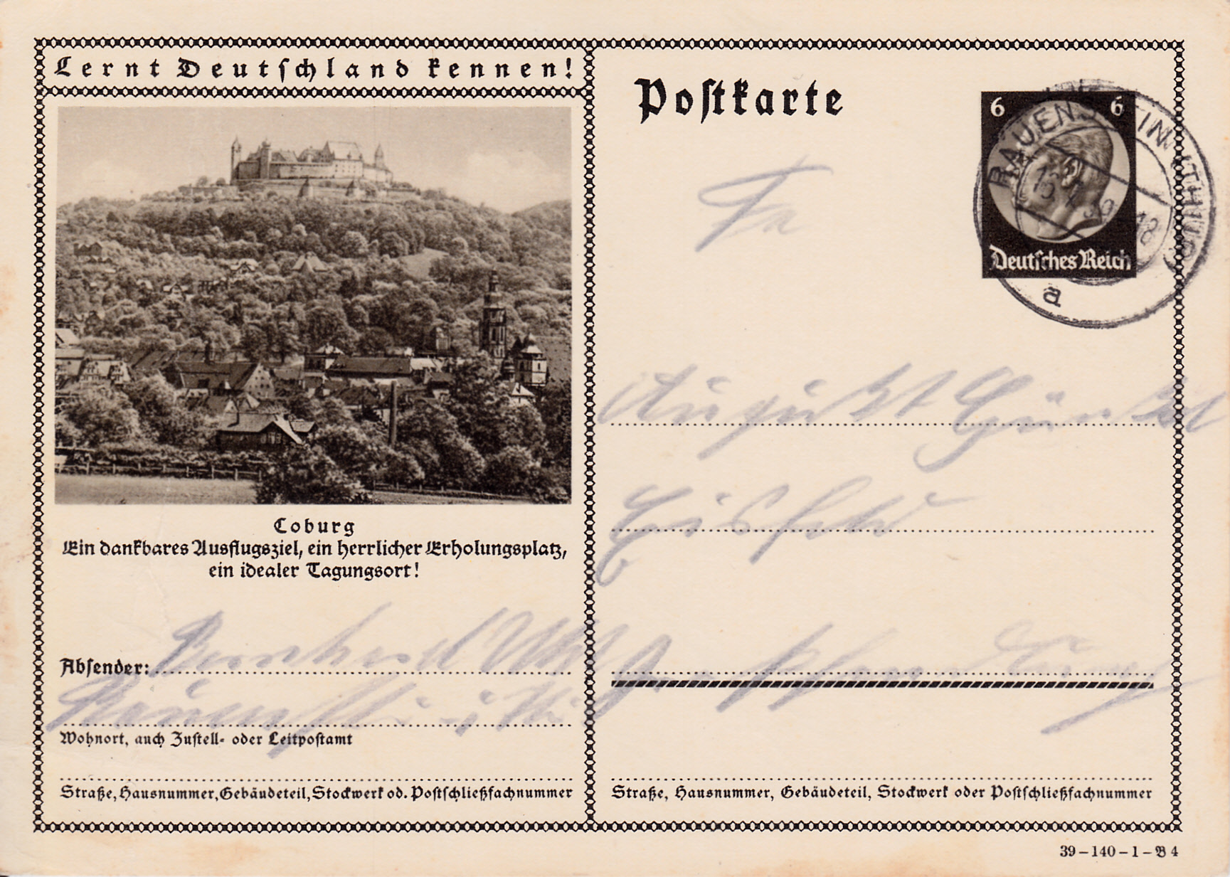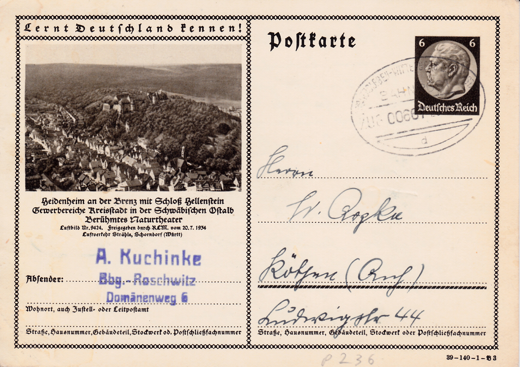 Heidenheim an der Brenz verwendet auf dieser Karte (Serie 140 Bild 3) das gleiche Luftbild mit dem Ort und dem Schloss Hellenstein wie 1936, jetzt aber in einem etwas anderes Format.