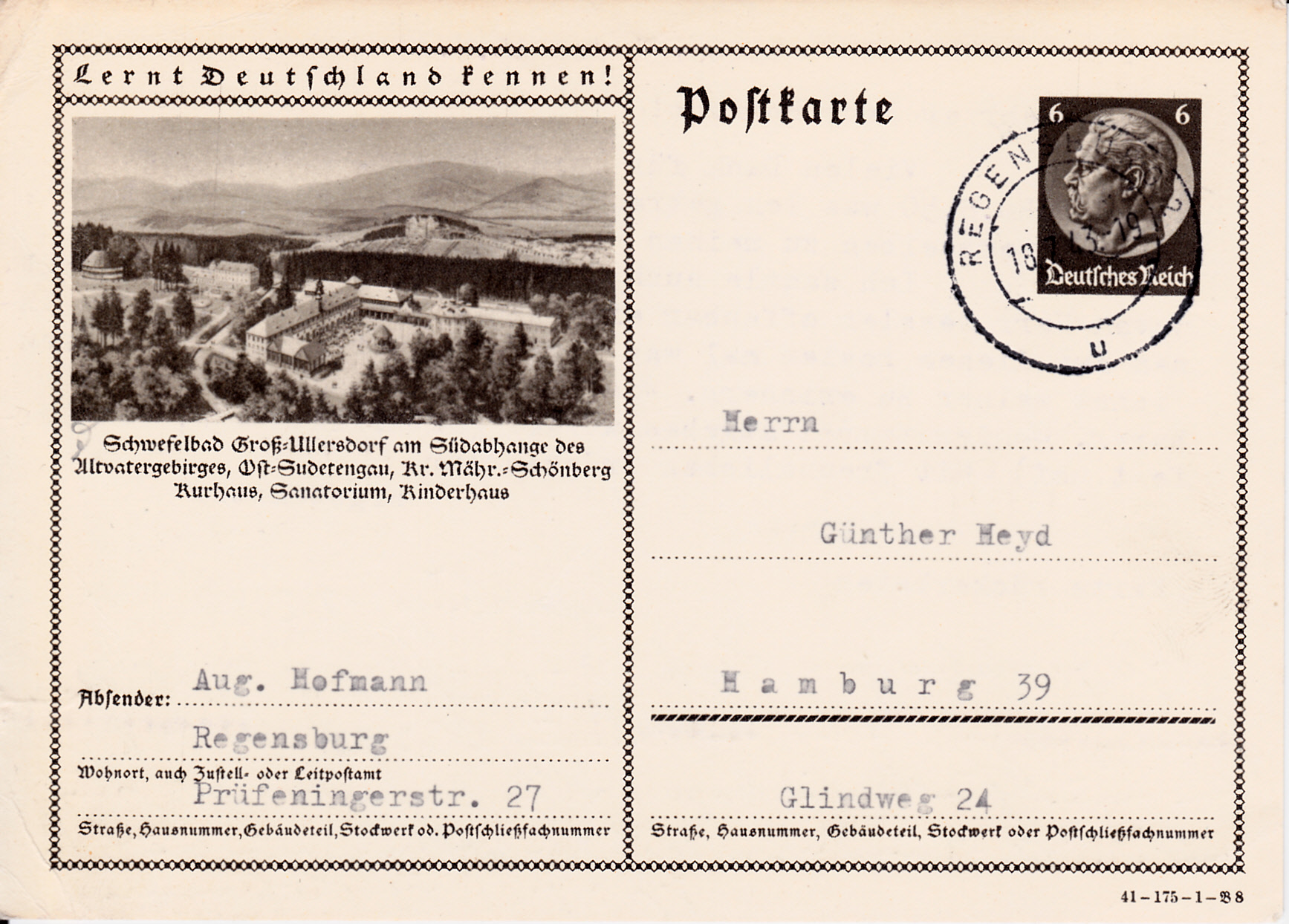 Auf dieser Karte (Serie 175 Bild 8) stellt sich Groß Ullersdorf mit einem Foto als Schwefelbad mit Kurhaus, Sanatorium und Jinderhaus vor. Groß Ullersdorf heißt heute Velké Losiny und ist eine Gemeinde in Tschechien.