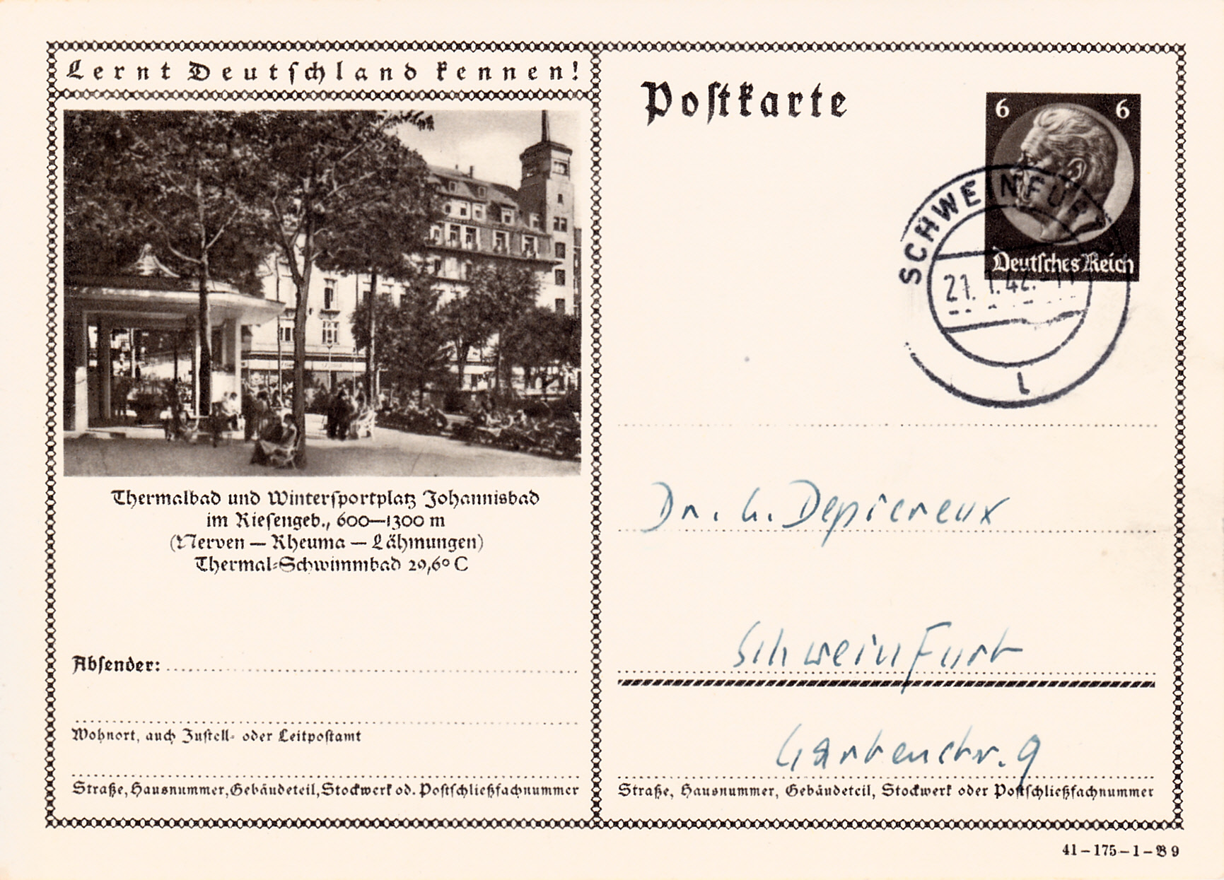 Eine Ansicht aus Johannisbad zeigt uns diese Bildpostkarte (Serie 175 Bild 9). Johannisbad heißt heute Janské Lázně und ist ein Kurort im tschechischen Riesengebirge.
