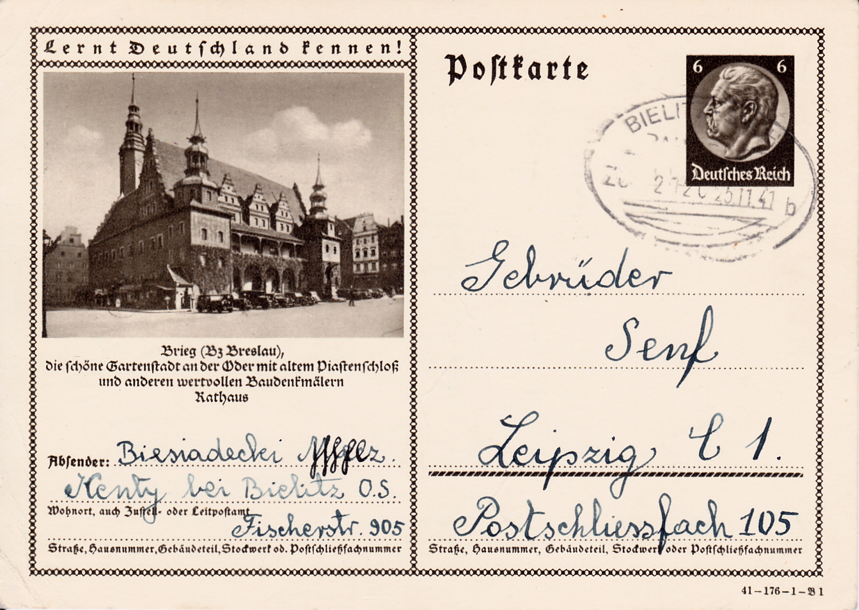 Brieg (Bz Breslau) bildet auf dieser Karte (Serie 176 Bild 1) wieder wie im Jahre 1936 das Rathaus ab. Brieg heißt heute Brzeg und ist eine Kreisstadt im Powiat Brzeski der polnischen Woiwodschaft Opole. Von 1311 bis 1675 war Brieg Residenzstadt des gleichnamigen Herzogtums und von 1907 bis 1945 kreisfreie Stadt im Deutschen Reich.