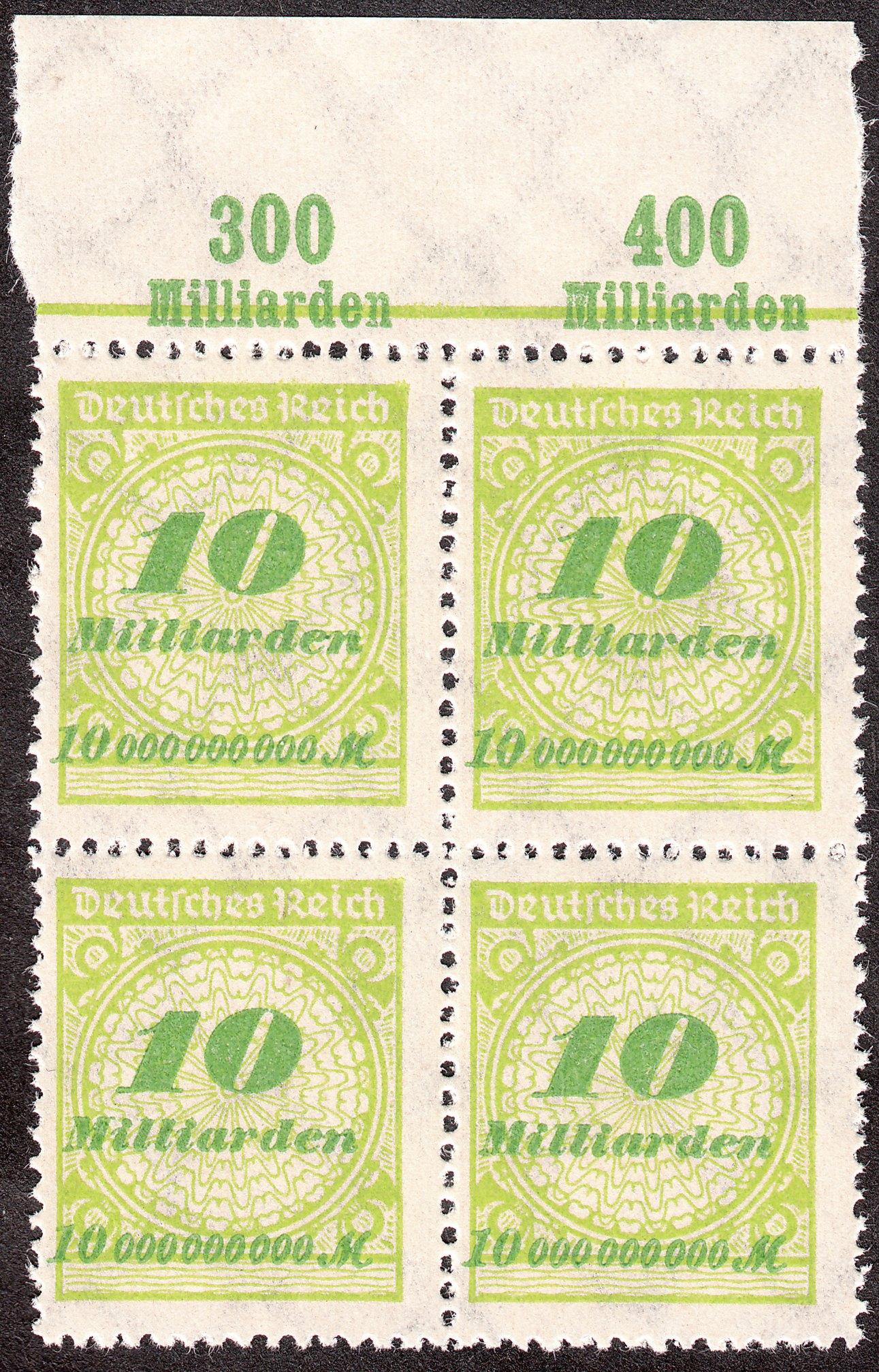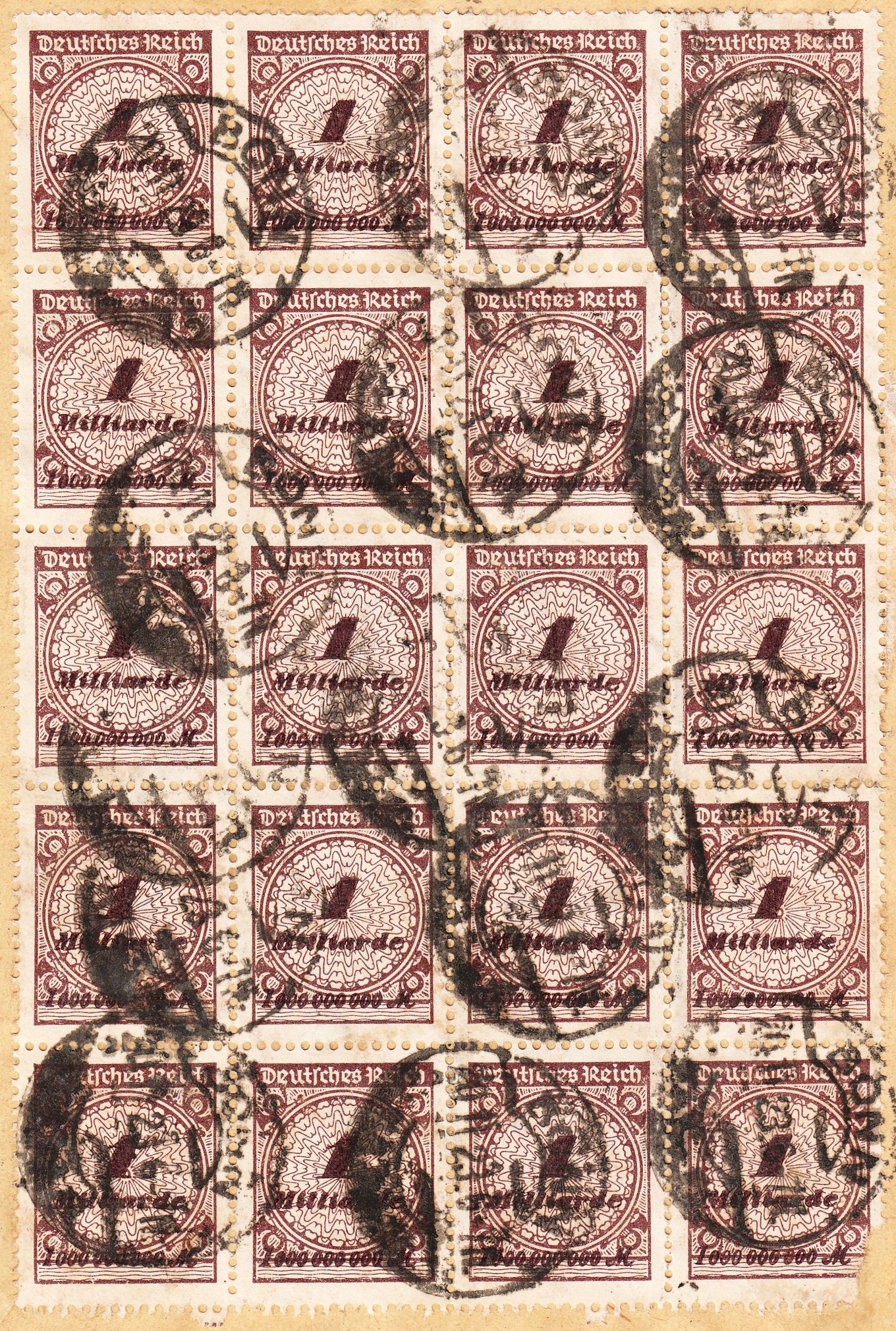Vom 12.11.1923 bis zum 19.11.1923, also ganze 8 Tage lang, galt für einen Brief im Fernverkehr die hier als Mehrfachfrankatur mit einem Paar der MiNr. 327 A P dargestellte Portostufe von 10 Milliarden Mark: