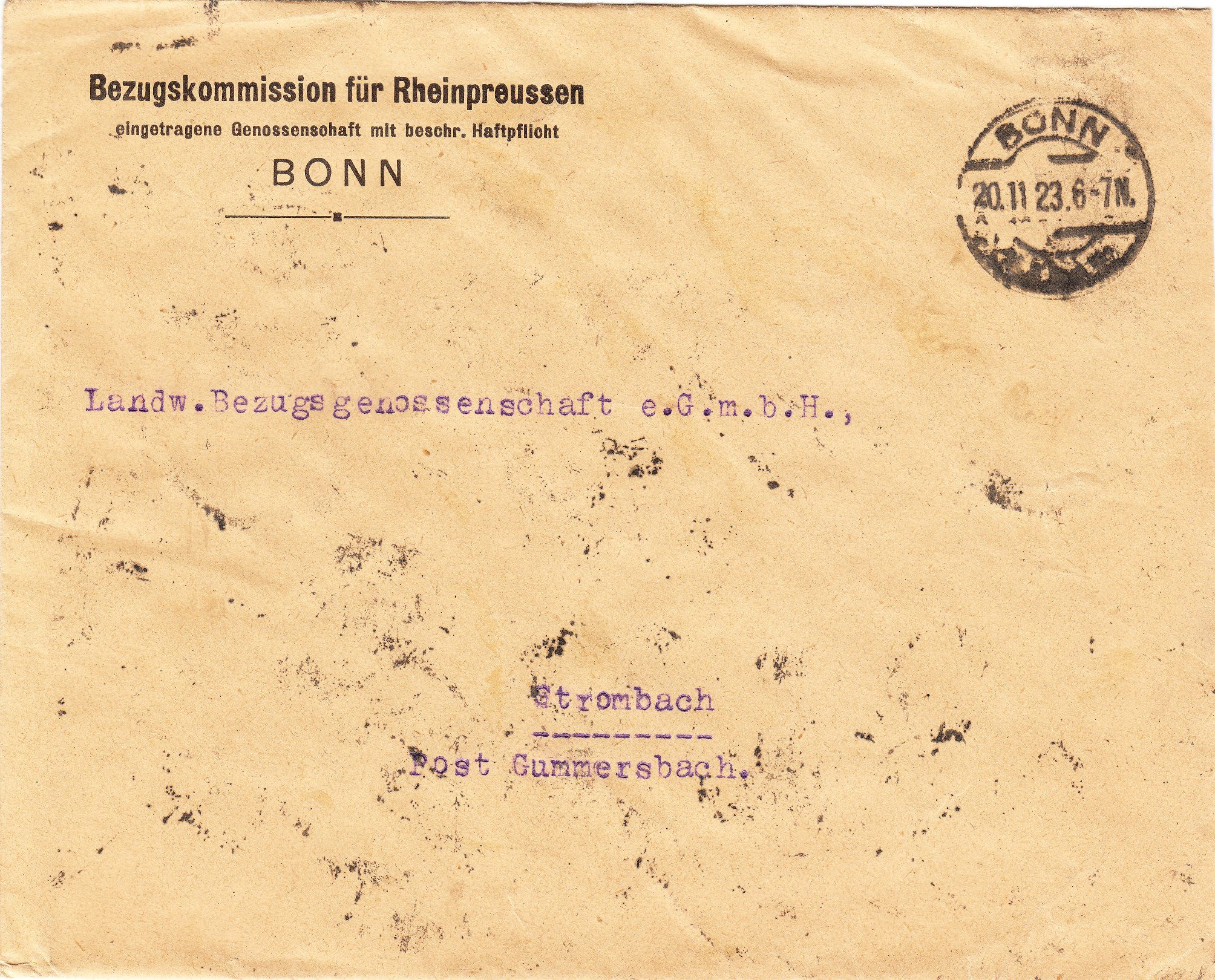 Mehrfachfrankatur von 20 Stück der MiNr. 325 A P a am 20.11.1923 als Ersttag dieser nur ganze 6 Tage geltenden Portostufe portorichtig auf der Rückseite eines Fernbriefes von Bonn nach Strombach, Post Gummersbach verklebt:
