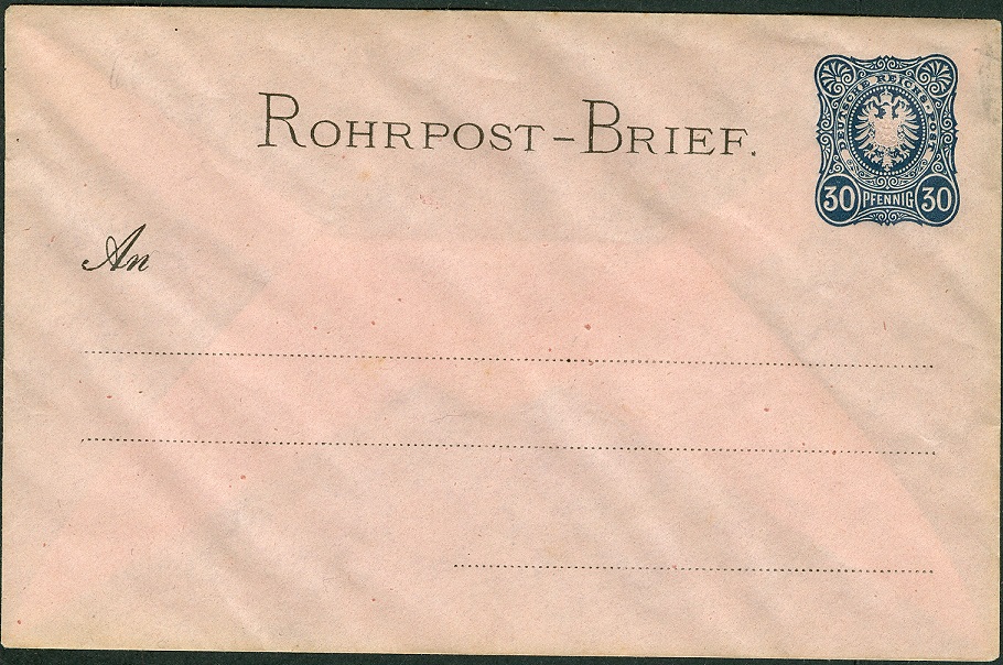 Im Jahre 1893 brachte die Deutsche Reichspost einen nächsten Rohrpostumschlag, den im MICHEL katalogisierten RU 3, in Umlauf. RU 3 war, im Gegensatz zu den Vorgängerumschlägen RU 1 und RU 2, nicht mehr durchsichtig. Hier ein ungebrauchtes Exemplar.