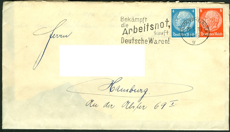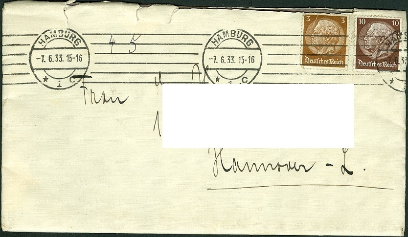 Hier ein nach Hamburg adressierter Beleg dieser Portostufe 44 Pfennig, frankiert mit je zwei MiNr. 518 sowie MiNr. 519, aufgegeben am 11.06.1936 in Berlin: