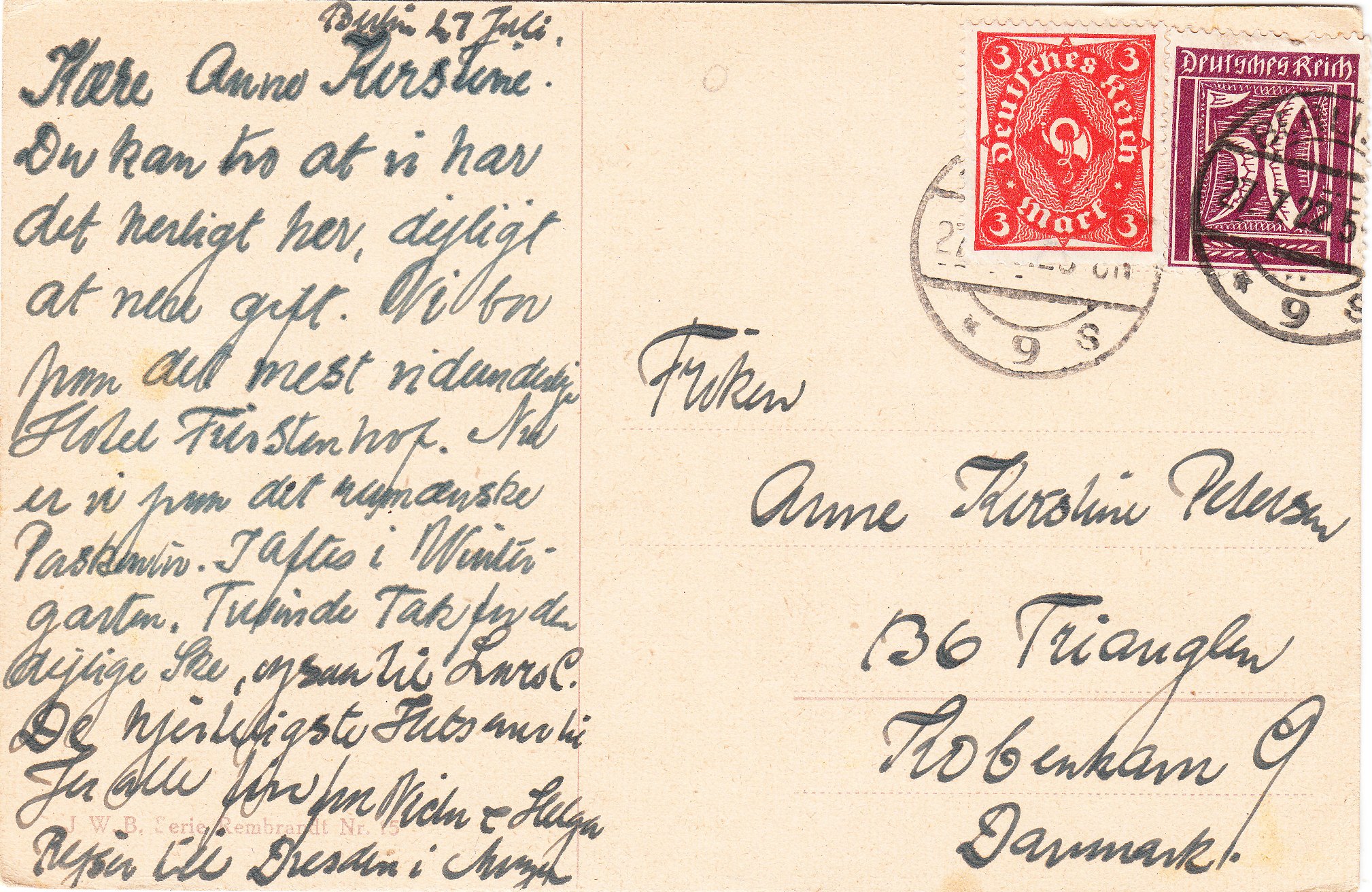 Hier eine am 27.07.1922 in Berlin aufgegebene Ansichtskarte nach Dänemark: