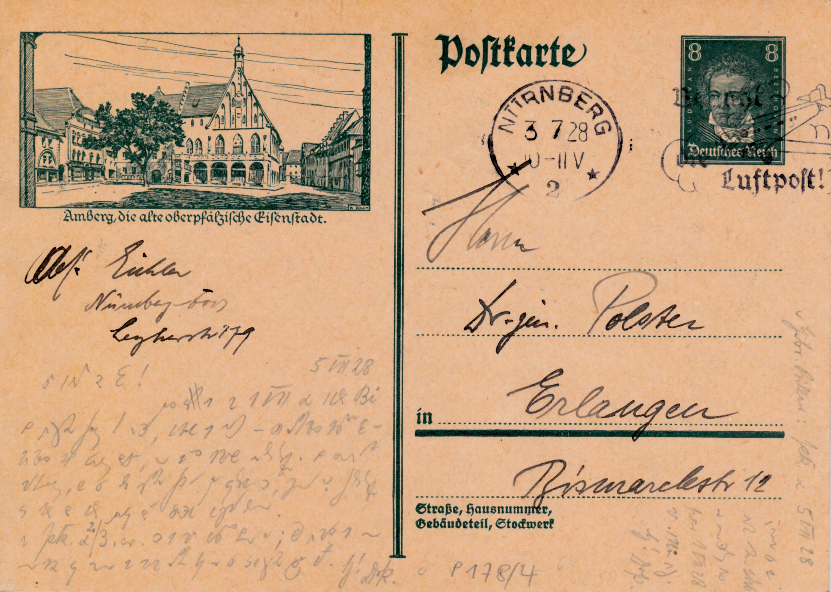 Die Bildpostkarte 1927 mit der MiNr P 178/04 mit dem Wertstempel "Berühmte Deutsche" 8Pf zeigt eine weitere Abbildung aus Amberg.