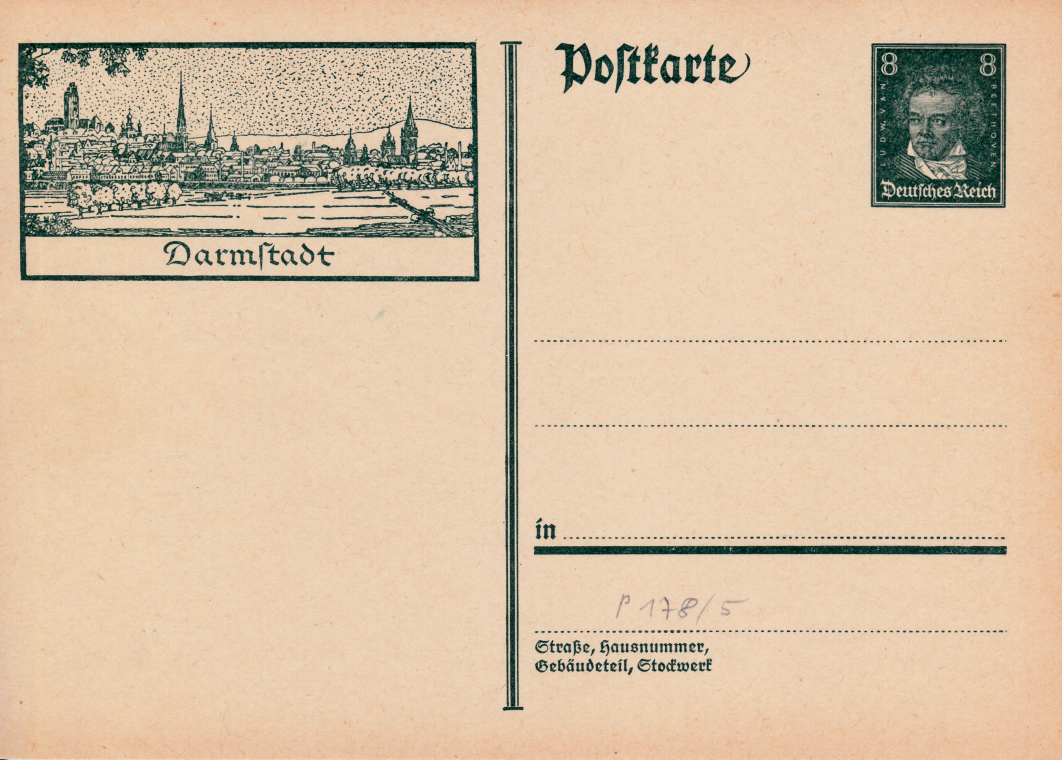 Diese Bildpostkarte 1927 mit der MiNr P 178/05 mit dem Wertstempel "Berühmte Deutsche" 8Pf zeigt eine Ansicht von Darmstadt.