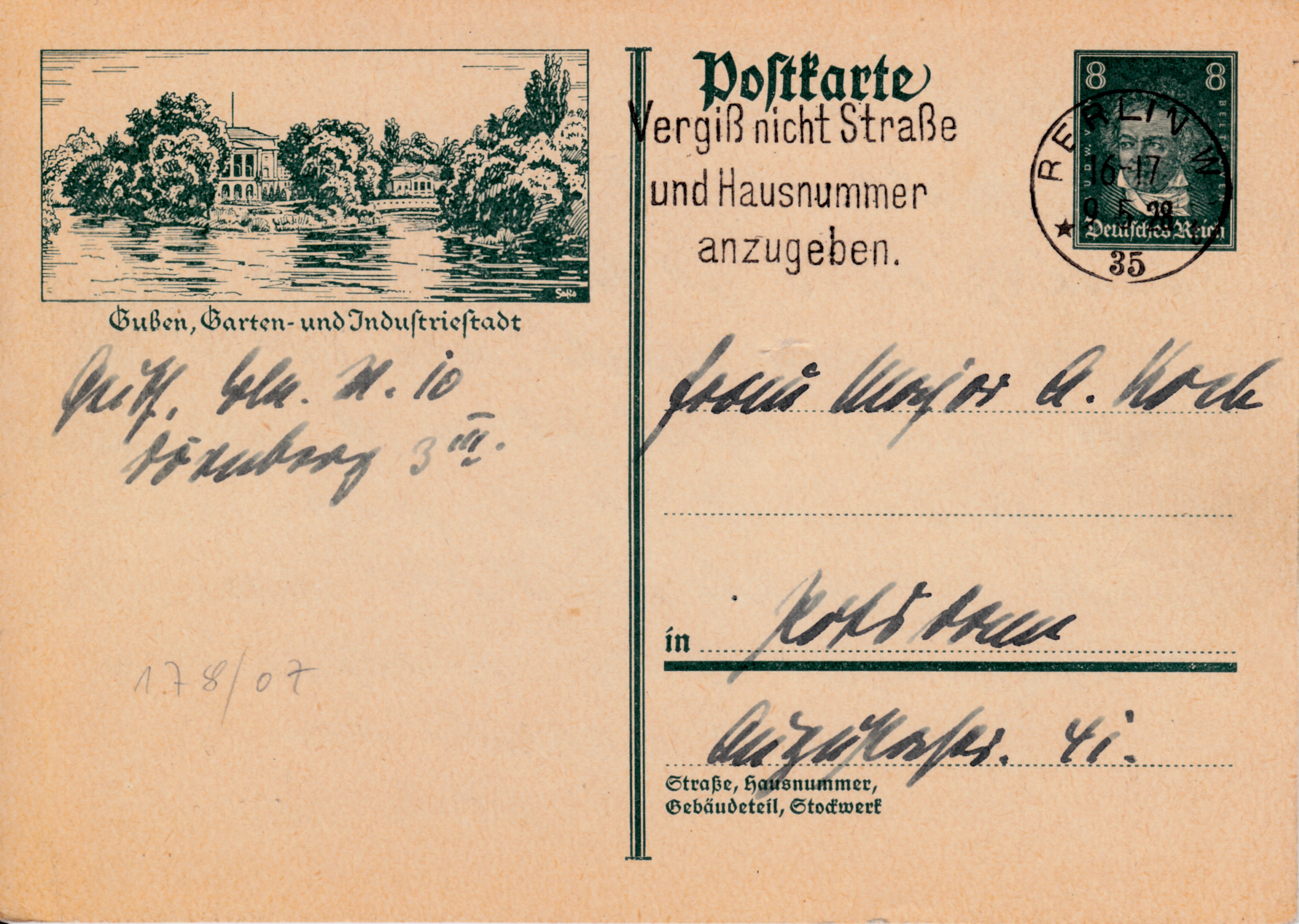 Die Bildpostkarte 1927 MiNr P 178/07 mit dem Wertstempel "Berühmte Deutsche" mit dem Porträt 8Pf wirbt eine Ansicht Guben für die Garten- und Industriestadt Guben.
