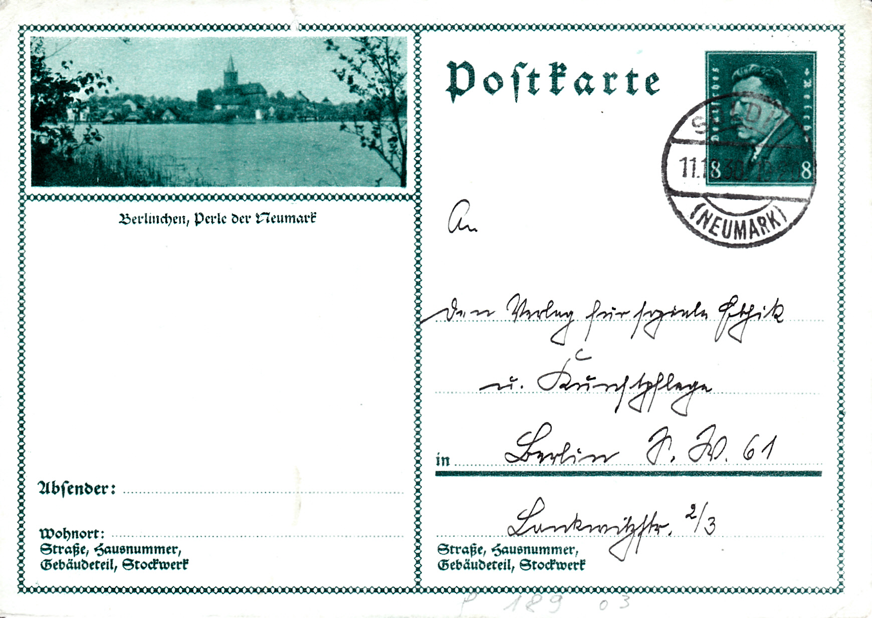 Auf dieser Bildpostkarte (MiNr P 189/03) wird ein Foto von Berlinchen in der Neumark abgebildet.