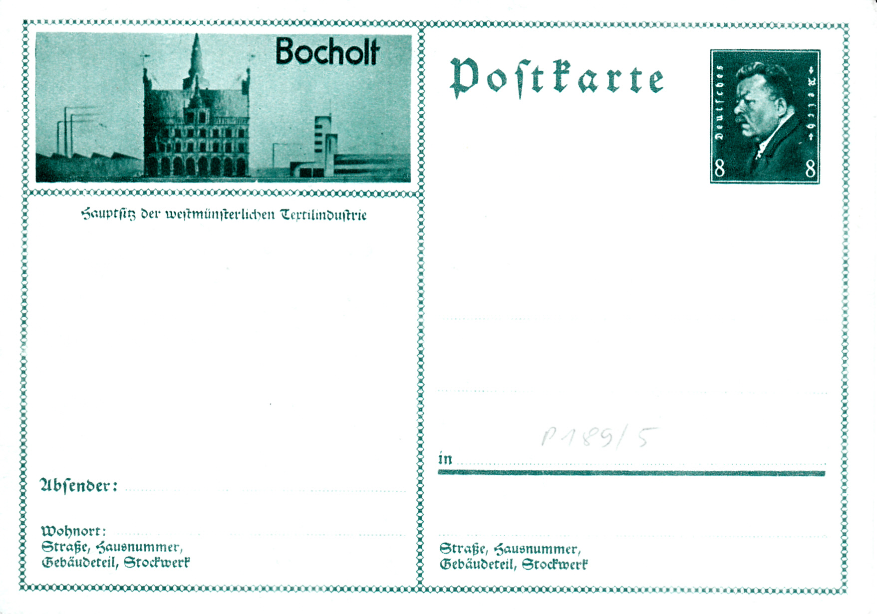 Diese Bildpostkarte (MiNr 189/05) macht Werbung für die Stadt Bocholt und Textilindustrie.