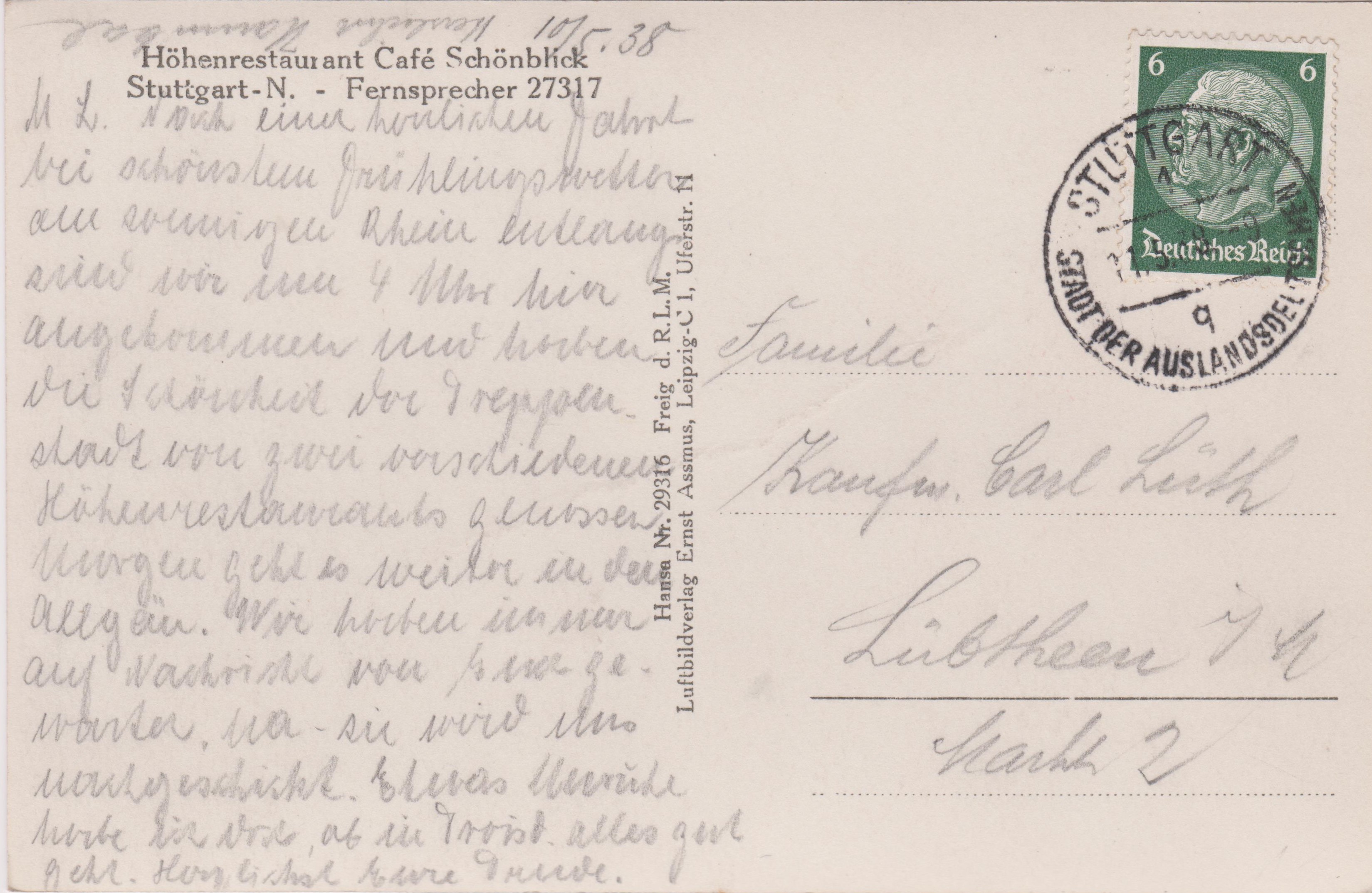 Die Ortsbezeichnung im Poststempel lautet "STUTTGART STADT DER AUSLANDSDEUTSCHEN" und der Stempel wirbt für die "VI. Reichstagung d. Auslandsdeutschen 26.8.-4.9.38".
