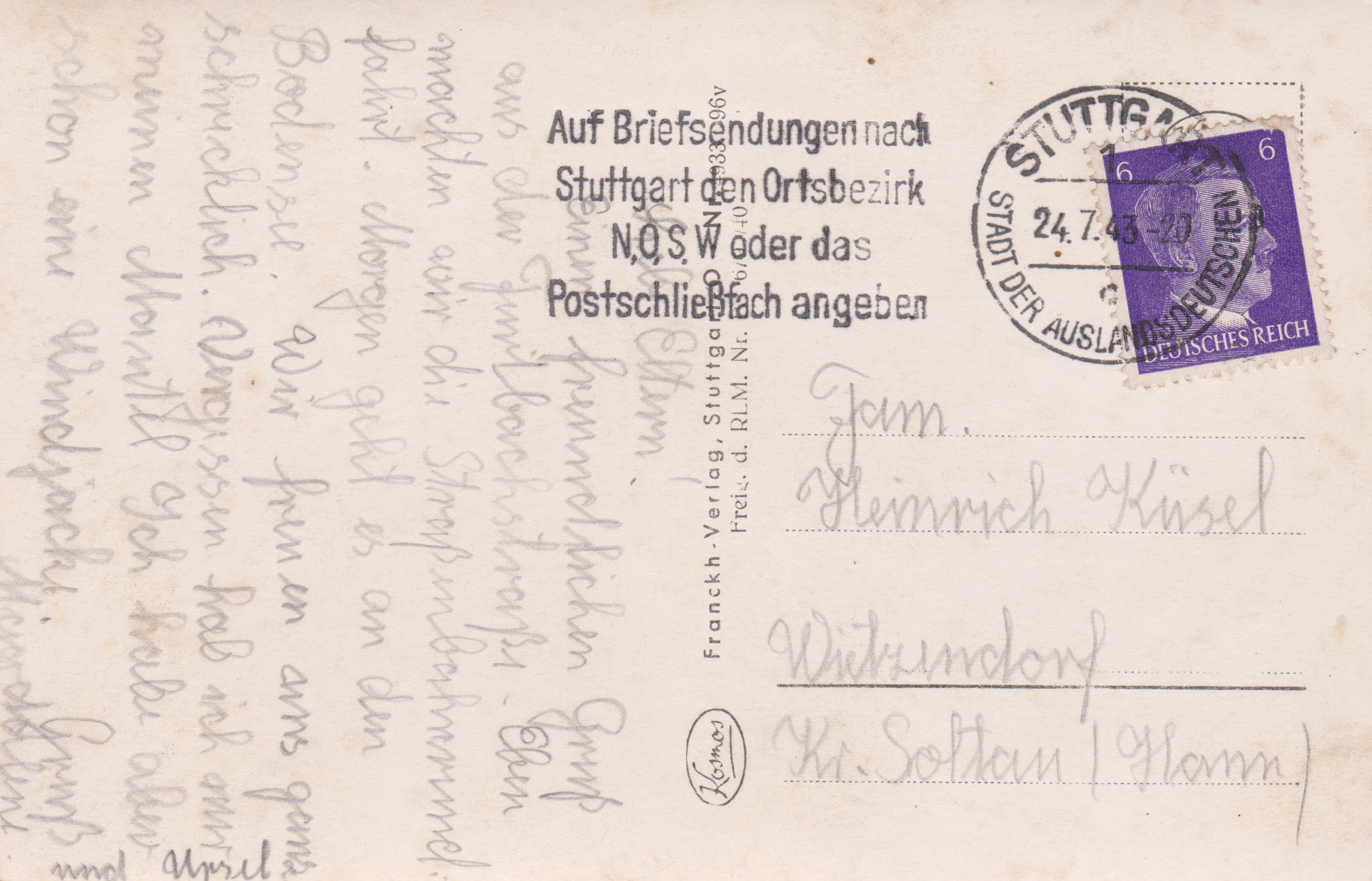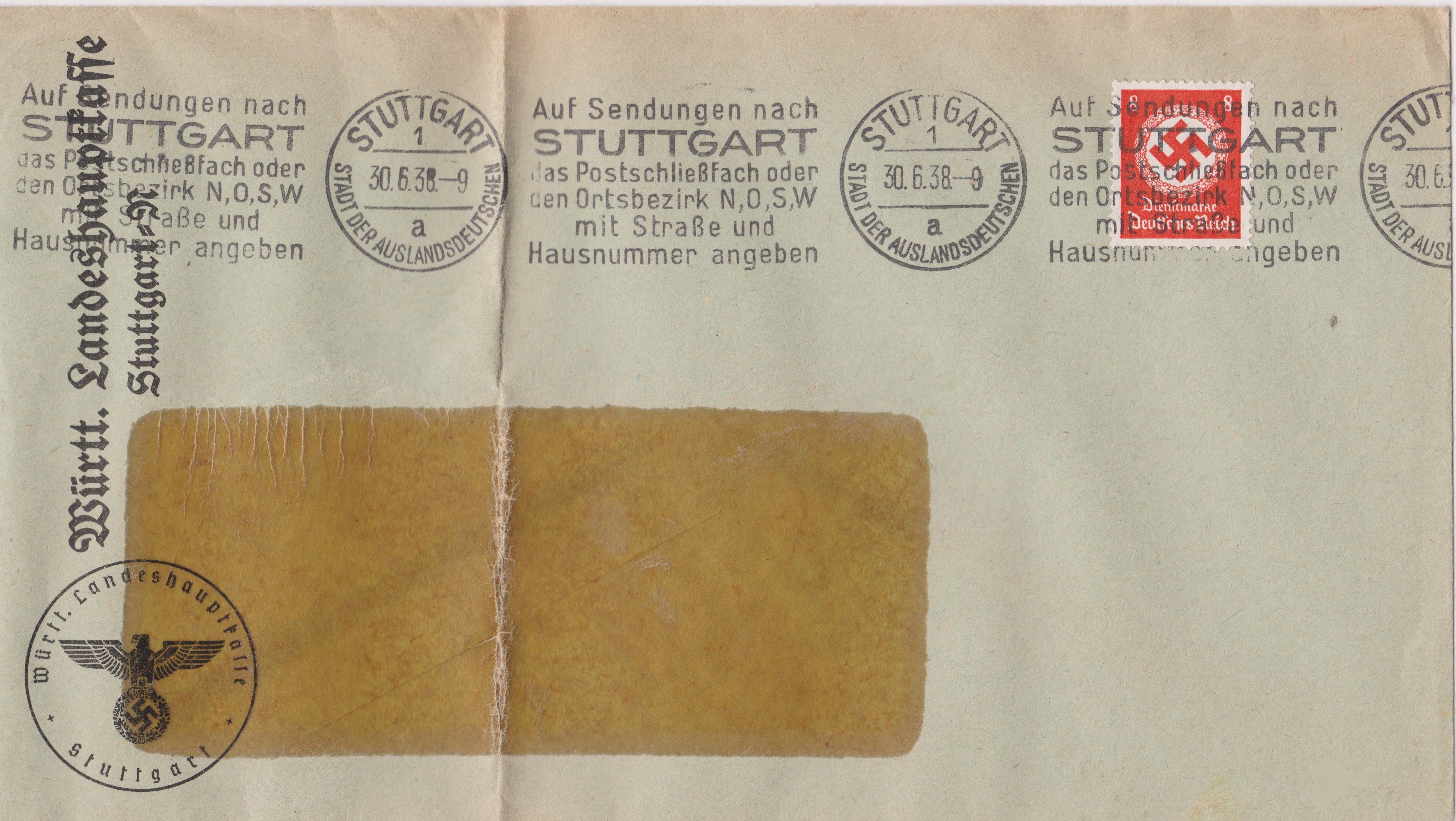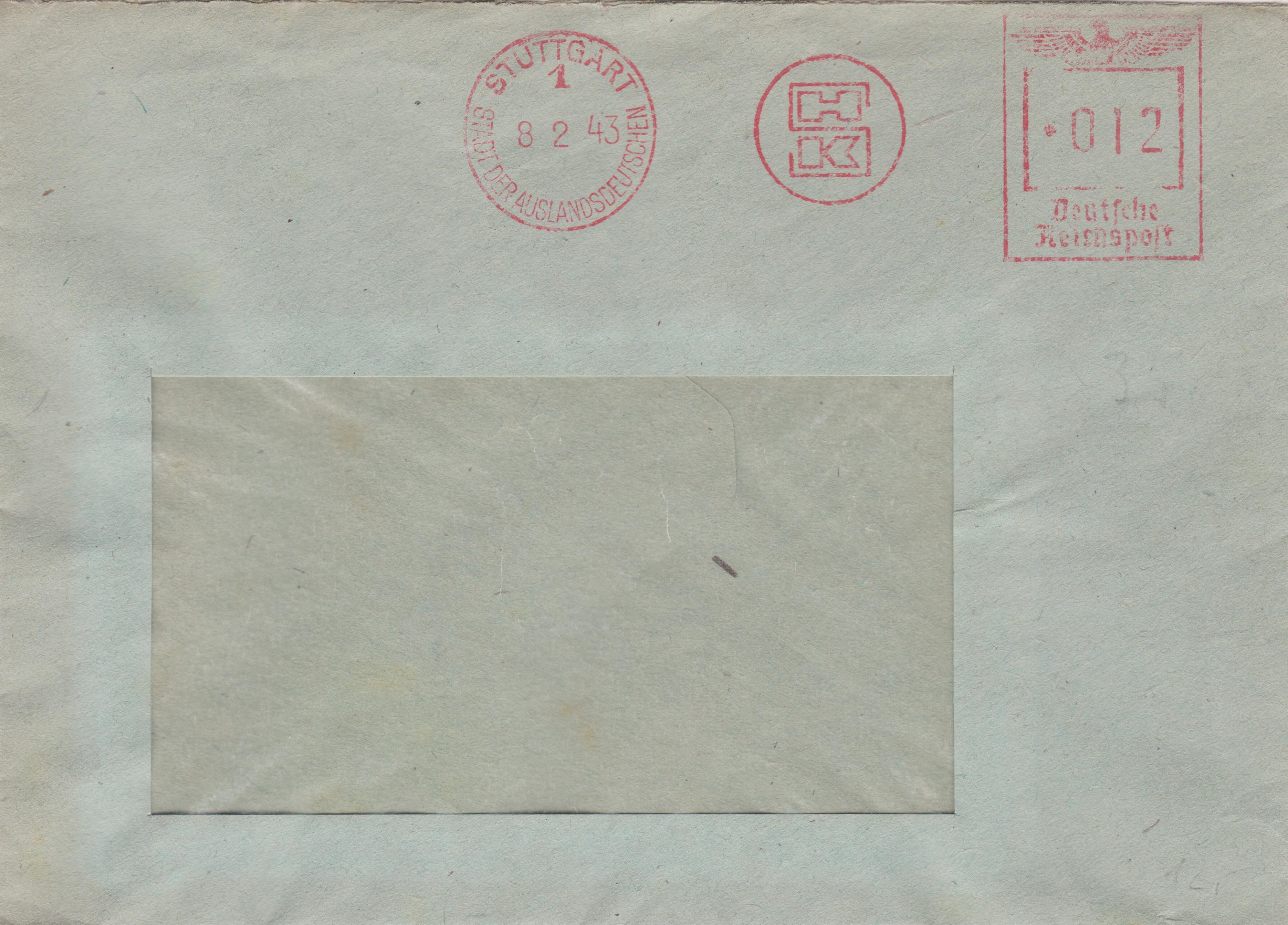 Gestempelt wurde der Brief jedoch erst an seinem Bestimmungsort mit einem aptierten Tagesstempel "STUTTGART 1 ag", aus dem der Zusatz "STADT DER AUSLANDSDEUTSCHEN" entfernt worden war: