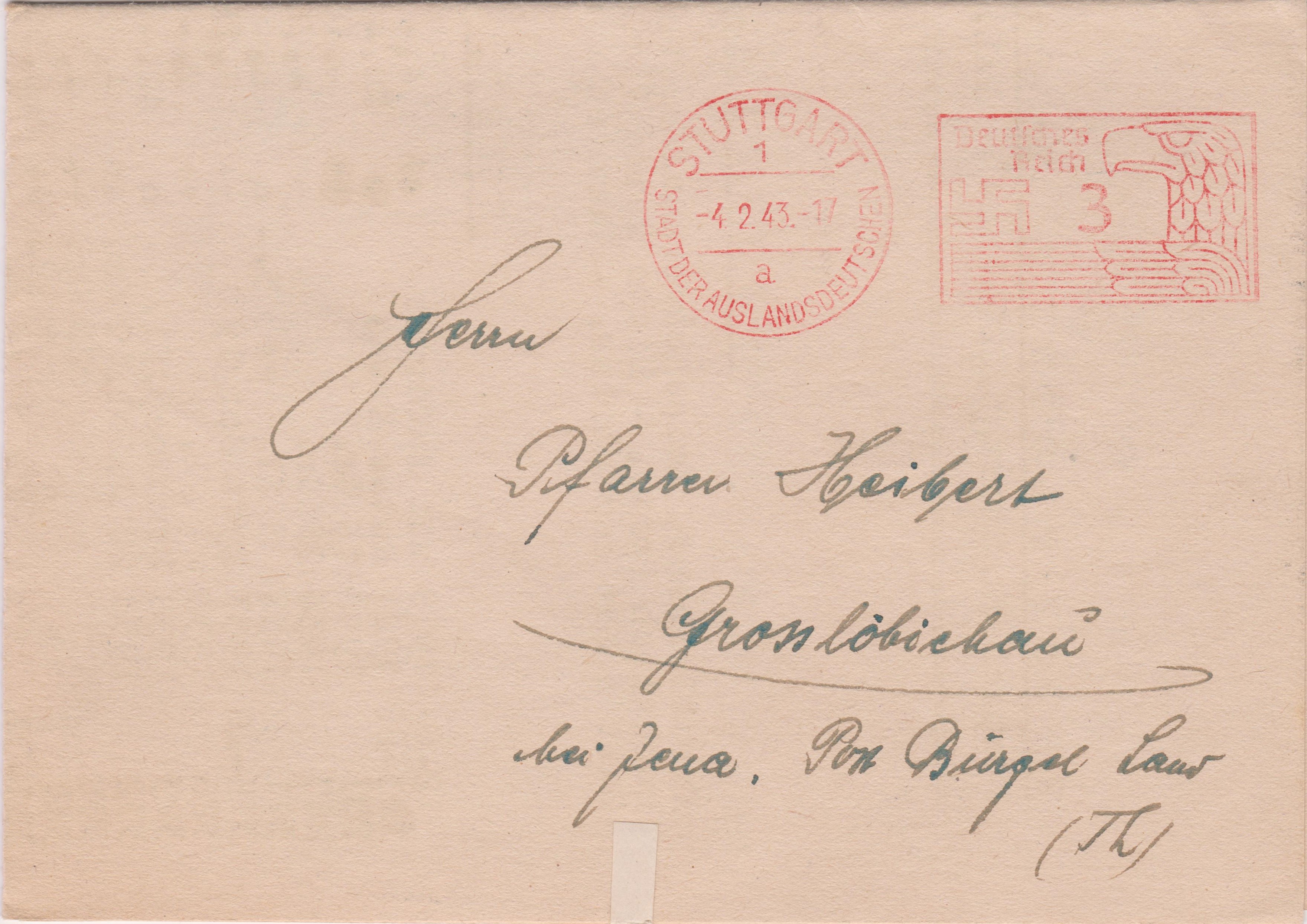Auch in Absenderfreistempeln wurde in STUTTGART 1 der Zusatz "STADT DER AUSLANDSDEUTSCHEN" aufgenommen wie bei diesem Exemplar vom 08.02.1943: