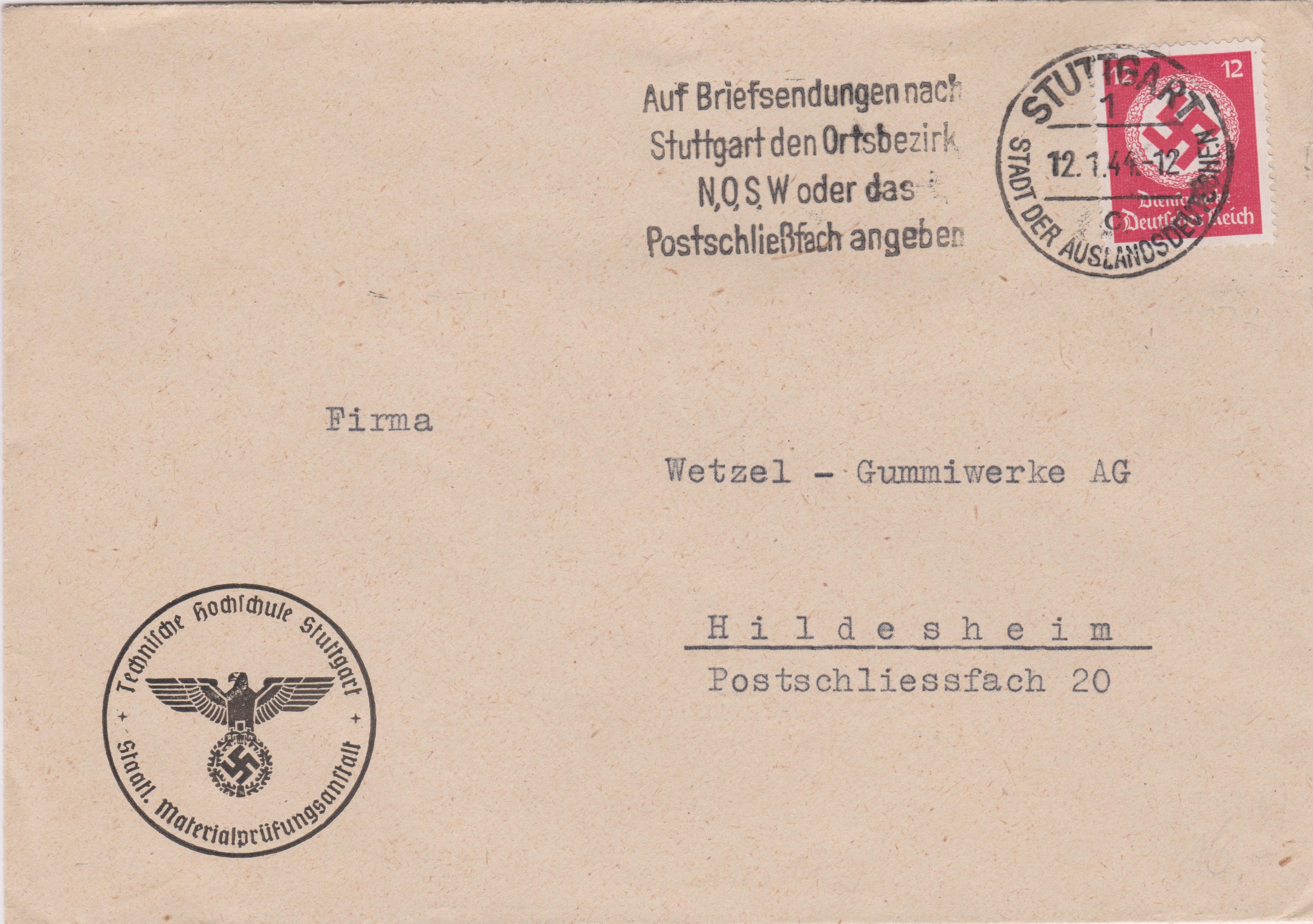 Brief im Fernverkehr, Portostufe 12 Pf, gelaufen als Dienstpost von Stuttgart nach Hildesheim, entwertet am 12.01.1944 mit Maschinenstempel in "STUTTGART 1 c STADT DER AUSLANDSDEUTSCHEN":