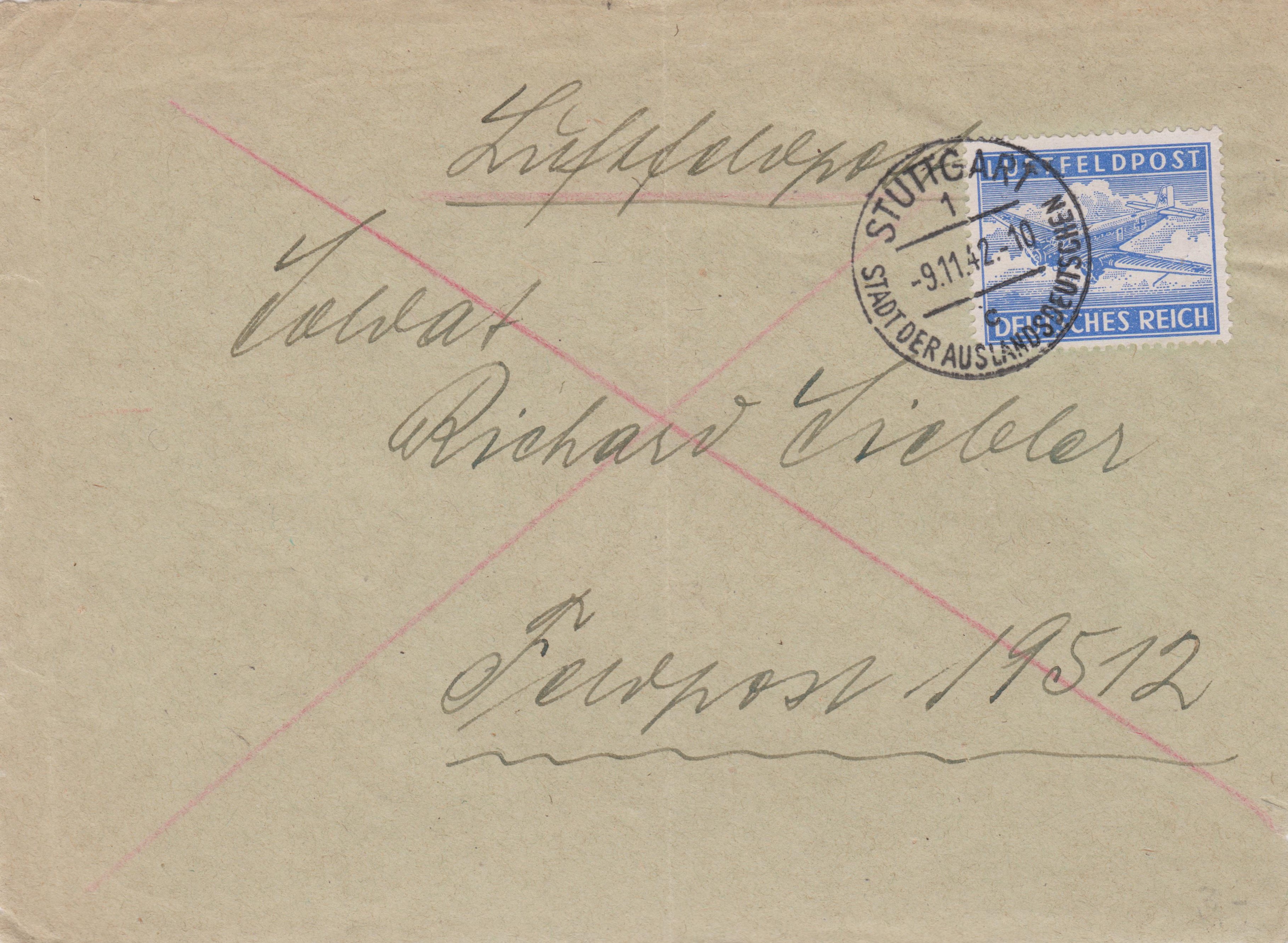 Und hier ein Abschlag eines Handstempels "STUTTGART 1 c STADT DER AUSLANDSDEUTSCHEN" am 09.11.1942 auf einem Luftfeldpostbrief an Feldpost Nr. 19512: